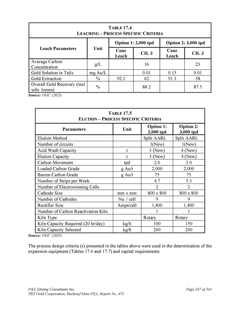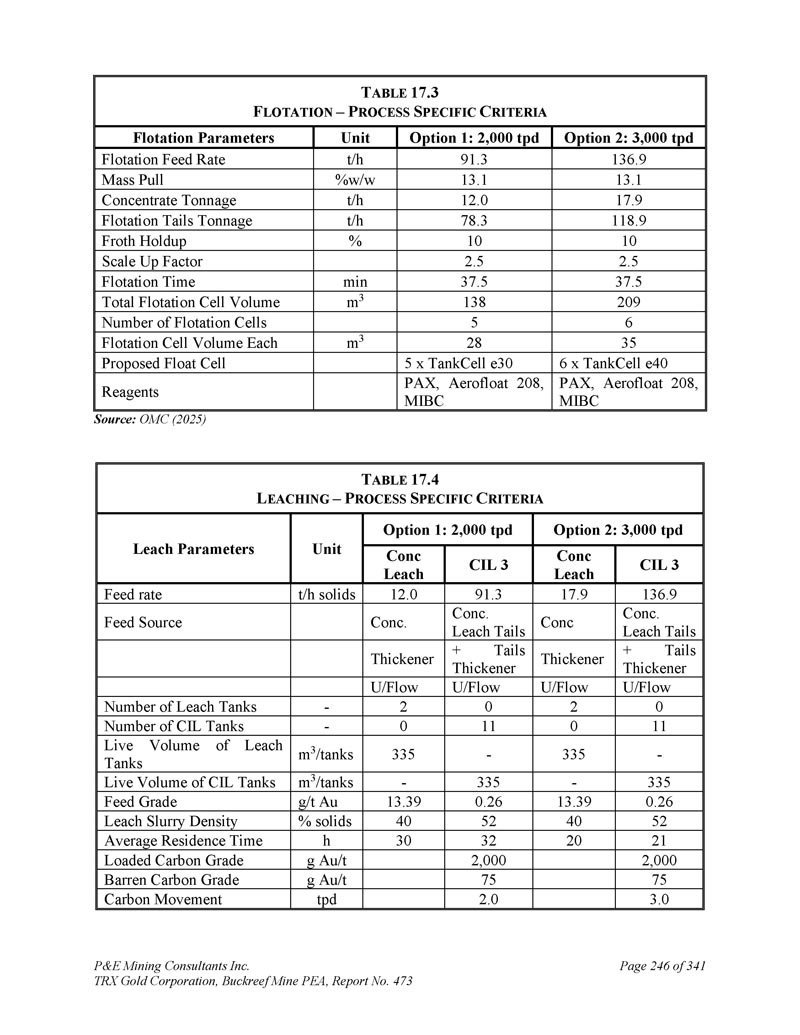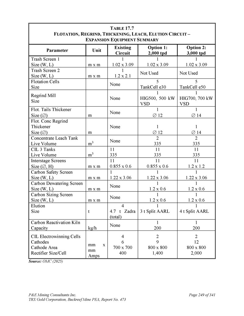 P & E Mining Consultants Inc. TRX Gold Corporation,Buckreef Mine PEA,Report No. 473 Page 249 of 341 T ABLE 17.7 F LOTATION,R EGRIND,T HICKENING,L EACH,E LUTION C IRCUIT – E XPANSION E QUIPMENT S UMARY Option 2:3,000 tpd Option 1:2,000 tpd现有电路单元参数11.02 x 3.09 11.02 x 3.09 11.02 x 3.09 m x m垃圾屏1尺寸(W,L)未使用11.2x 2.1 m x m垃圾屏2尺寸(W,L)5台TankCell e50 5台TankCell e30无浮选槽尺寸1 HIG700,700千瓦VSD 1 HIG500,500千瓦VSD无回磨机尺寸114112无m Flot。尾料增稠剂尺寸()114112无m浮层。conc再研稠剂尺寸()23352335无m 3精矿沥出罐活体体积113351133511335 m 3 CIL 3罐活体体积111.2 x 1.21 10.855 x 0.61 10.855 x 0.6 m x m级间筛子尺寸(,H)11.22 x 3.06 11.22 x 3.06 m x m碳安全筛子尺寸(W,L)11.2 x 0.6 11.2 x 0.6无m x m碳脱水筛子尺寸(W,L)11.2x0.611.2x0.6无m x m碳尺寸屏幕尺寸(W,L)14t分体AARL 13t分体AARL 44.7t Zadra(总)t洗出尺寸12001200无kg/h碳再活化窑容量212800 x8002,00029800 x8001,40046700 x700400mm xmm Amps CIL电积电池阴极阴极面积整流器尺寸/电池片源:OMC(2025)