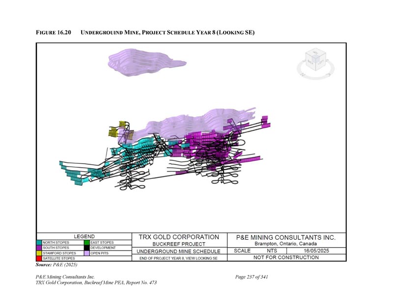 F IGURE 16.20 U NDERGROUIN M INE,P ROJECT S CHEDULE Y EAR 8(L OOKING SE)资料来源:P & E(2025)P & E Mining Consultants Inc. TRX Gold Corporation,Buckreef Mine PEA,第473号报告,共341页第237页