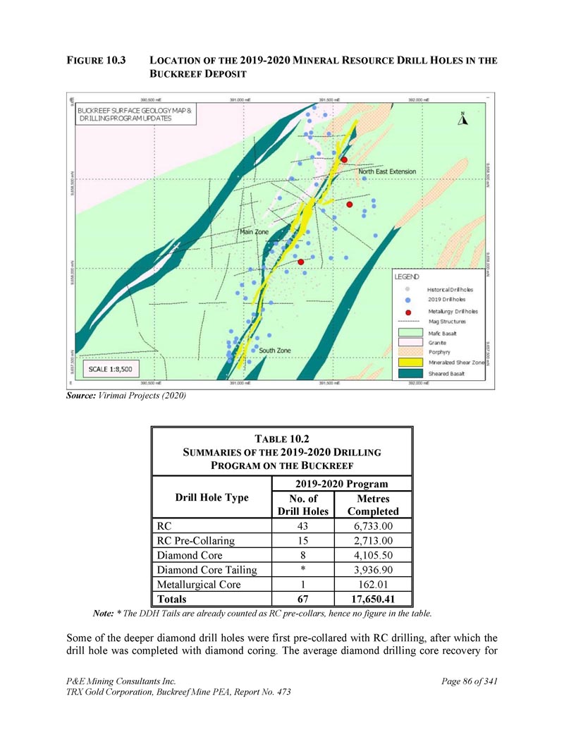 本技术报告的日期。最大的单次钻孔计划于2019-2020年完成,期间完成67个钻孔,17,650米。图10汇总了从2007年前计划到2019年至2020年计划的钻探情况。2和表10。1 .主带和东部斑岩带的地表钻孔位置和显示钻孔方向和长度的钻孔轨迹见附录A。F IGURE 10.2L Ocation of H ISTORICAL RC/DDH E XPLORATION和M INERAL R ESOURCE D RIL H OLES资料来源:Buckreef Gold Mine(2019)和Virimai Projects(2020)P & E Mining Consultants Inc.,Buckreef Mine PEA,报告第473页,共341页