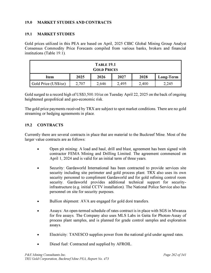 P & E Mining Consultants Inc. TRX Gold Corporation,Buckreef Mine PEA,第473号报告,共3411页第262页。市场研究和合同2。市场研究本PEA中使用的黄金价格基于2025年4月CIBC全球矿业集团分析师共识商品价格预测,这些预测由多家银行、经纪商和金融机构汇编而成(表19。1 ) .T ABLE 19.1 G OLD P RIES Long-Term 2028202720262025 Item 2,2452,4002,4952,6462,707 Gold Price(US $/oz)Gold surged to a record high of 3,500.10 US USD/oz on Tuesday April 22,2025 on the back of continuous increased geopolitical and geo-economic risks。TRX收到的黄金价格付款视现货市场情况而定。目前还没有到位的黄金流动或对冲协议。2.合同目前有几份合同对Buckreef矿具有重要意义。大部分较大价值的合同如下:露天采矿:一次装载和运输,钻探和爆破,已与承包商FEMA Mining and Drilling Limited签署协议。该协议于2024年4月1日开始生效,初始有效期为三年。安保:GardaWorld International已签约提供包括场地周界和黄金工艺厂房在内的服务场地安保。TRX也使用了自己的安全人员来称赞GardaWorld,并为黄金精炼控制室的安全。GardaWorld为安全-基础设施(例如初始CCTV安装)提供额外的技术支持。国家警察局也有人员在现场进行安保。金银出货:AVA从事黄金dor é转让。Assays:与Mwanza的SGS签订了一份开放式的费率时间表合同,用于火灾化验。该公司还将Geita的MLS实验室用于工艺工厂样本的光子分析,并计划用于等级控制样本和勘探分析。电力:TANESCO根据议定费率从国家电网供电。柴油:由AFROIL承建及供应。