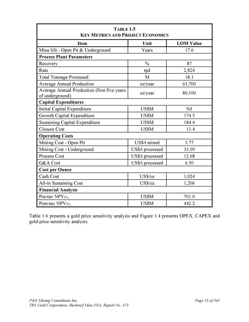 P & E Mining Consultants Inc. TRX Gold Corporation,Buckreef Mine PEA,第473号报告第15页,共341吨ABLE 1.5K EY M ETRICS和P ROJECT E CONOMICS LOM值单位项目17.6年矿山寿命-露天和地下工艺装置参数87%回收率2,824吨日产1810万吨处理总量61,700盎司/年平均年产量80,100盎司/年平均年产量(地下前五年)资本支出无美元m初始资本支出174.5美元m增长资本支出184.4美元m维持资本支出13.4美元m关闭成本运营成本3.77美元/t开采成本-露天矿33.09美元/t加工开采成本-地下12.68美元/吨加工工艺成本6.50美元/吨每盎司加工G & A成本成本1,024美元/盎司现金成本1,206美元/盎司全部-维持成本财务分析701.0美元m税前NPV 5% 442.2美元m税后NPV 5%表1.6给出了黄金价格敏感性分析,图1.4给出了OPEX、CAPEX和黄金价格敏感性分析。