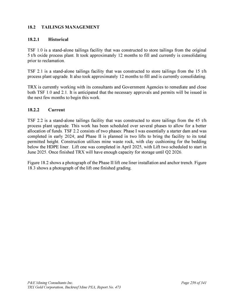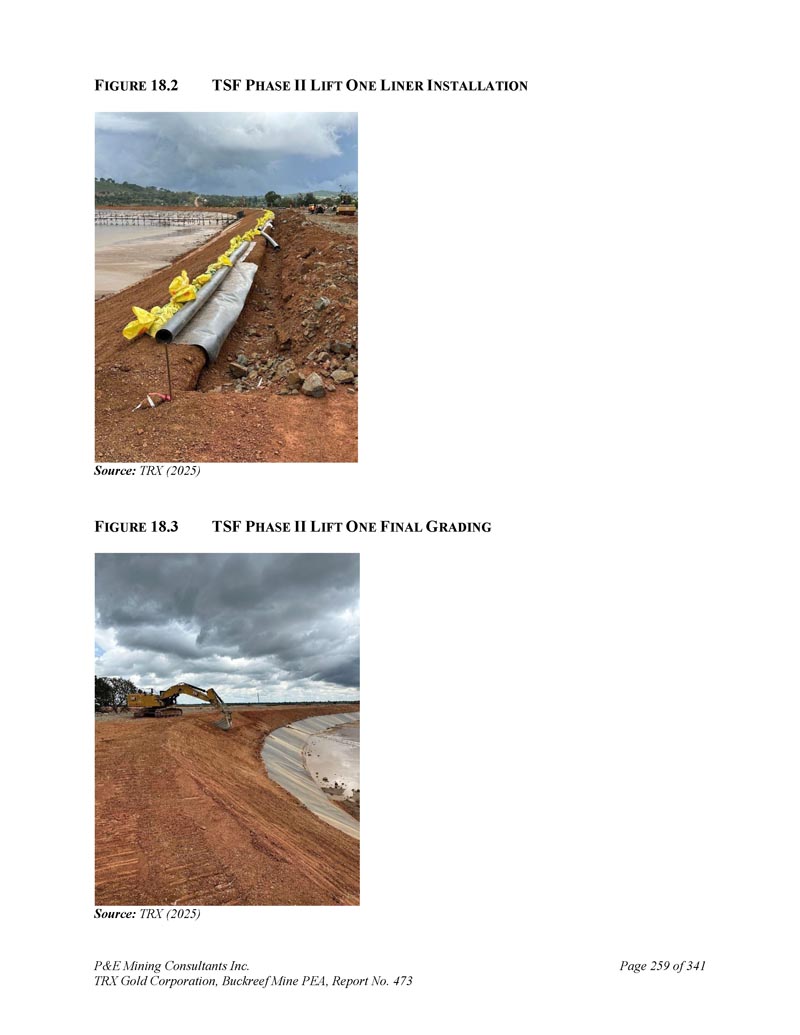 P & E Mining Consultants Inc. TRX Gold Corporation,Buckreef Mine PEA,第473号报告,第341页第258页2。尾矿管理1。历史TSF 1。0是一个独立的尾矿设施,是为储存原5t/h氧化物工艺装置的尾矿而建造的。填埋耗时约12个月,目前正在填海前巩固。TSF 2。1是一个独立的尾矿设施,用于储存15 t/h工艺装置升级后的尾矿。它也花了大约12个月才填满,目前正在巩固。TRX目前正与其顾问和政府机构合作,以补救和关闭这两个TSF1。0和2。1 .预计未来几个月将发放必要的批准和许可证,以开始这项工作。2.当前TSF 2。2是一个独立的尾矿设施,用于储存45 t/h工艺装置升级后的尾矿。这项工作已安排在几个阶段,以便更好地分配资金。TSF 2。2个阶段包括两个阶段:第一阶段基本上是一个启动水坝,于2024年初完成;第二阶段计划分两部升降机,以使该设施达到其总允许高度。施工利用矿山废石,HDPE衬里下方的垫层有粘土缓冲。一号升降机于2025年4月完工,二号升降机计划于2025年6月开工。一旦完成TRX将有足够的容量存储到2026年第二季度。图18。图2展示了二期升降机一衬板安装和锚地沟的照片。图3.显示了一张完成分级的升降机的照片。