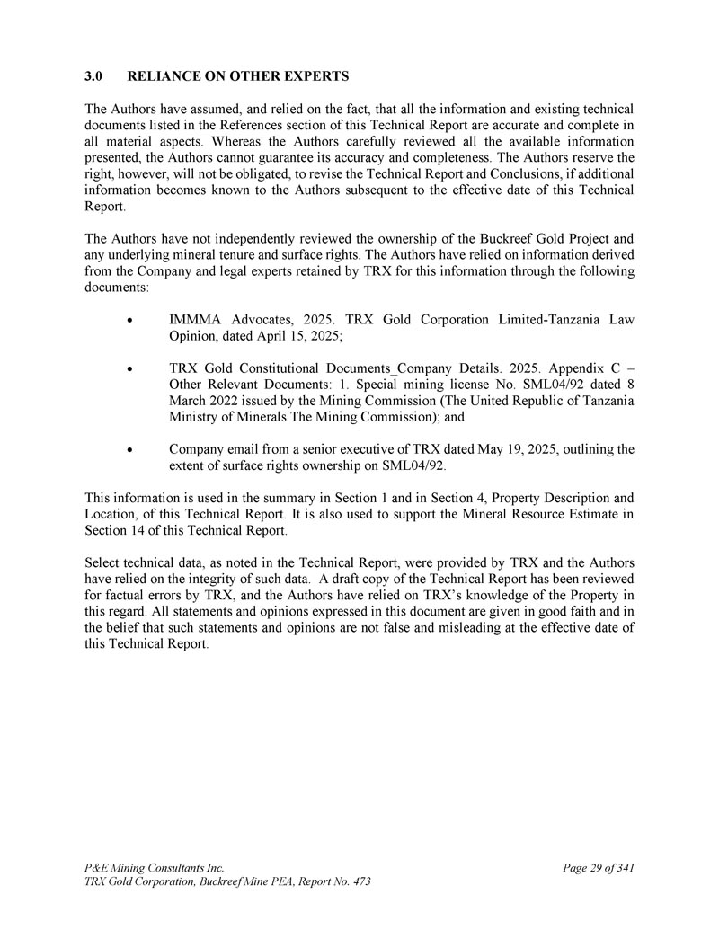 P & E Mining Consultants Inc. TRX Gold Corporation,Buckreef Mine PEA,报告第473期,共3411页,第29页。对其他专家的依赖作者假设并依赖于这一事实,本技术报告参考资料部分中列出的所有信息和现有技术文件在所有重要方面都是准确和完整的。尽管作者仔细审查了所提供的所有可用信息,但作者无法保证其准确性和完整性。但是,如果作者在本技术报告生效日期之后知悉更多信息,则作者保留修改技术报告和结论的权利,但不承担义务。提交人没有独立审查Buckreef黄金项目的所有权以及任何潜在的矿产权和地表权。作者通过以下文件依赖了从公司获得的信息以及TRX为获取这些信息而聘请的法律专家:IMMMA Advocates,2025。TRX Gold Corporation Limited-坦桑尼亚法律意见书,日期为2025年4月15日;TRX Gold宪法文件_公司详情。2025 .附录C –其他相关文件:1。特种采矿许可证编号SML 04/92,日期为2022年3月8日,由矿业委员会(坦桑尼亚联合共和国Minerals部,即矿业委员会)发布;以及TRX一位高级管理人员于2025年5月19日发送的公司电子邮件,其中概述了SML 04/92上地表权利所有权的范围。此信息用于本技术报告第1节和第4节,属性描述和位置中的摘要。它还用于支持本技术报告第14节中的矿产资源估算。如技术报告中所述,Select技术数据由TRX提供,作者所依赖的是此类数据的完整性。一份技术报告草稿副本已由TRX进行了事实错误审查,而作者在这方面依赖的是TRX对财产的了解。本文件中的所有陈述和意见均出于善意,并相信这些陈述和意见在本技术报告生效之日并不虚假和具有误导性。