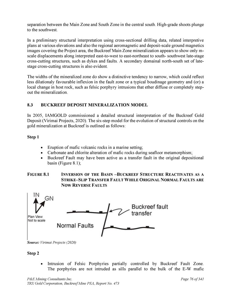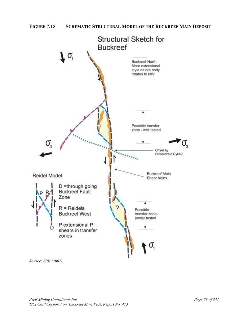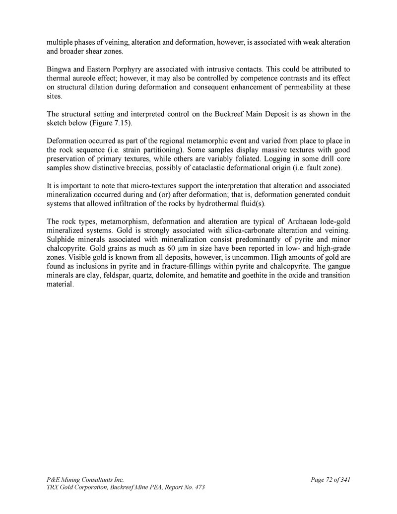 P & E Mining Consultants Inc. TRX Gold Corporation,Buckreef Mine PEA,第473号报告,341页第72页多阶段的脉化、蚀变和变形,然而,与弱蚀变和更广泛的剪切带有关。冰洼和东部斑岩与侵入性接触有关。这可能归因于热光环效应;然而,它也可能受到能力对比及其在变形过程中对结构膨胀的影响以及随之而来的这些地点渗透率增强的控制。Buckreef主矿床的构造设置和解释控制如下图所示(图7。15 ) .变形作为区域变质事件的一部分发生,并在岩石序列中因地而异(即应变分配)。一些样品显示出巨大的纹理,初级纹理保存得很好,而另一些样品则是可变的叶状。一些钻芯样品的测井显示出独特的角砾岩,可能是碎裂变形起源(即断裂带)。重要的是要注意到,微观纹理支持在变形期间和(或)之后发生蚀变和伴生矿化的解释;也就是说,变形产生了允许热液渗透岩石的导管系统。岩石类型、变质作用、变形和蚀变是太古代脉金矿化系统的典型特征。金与二氧化硅-碳酸盐蚀变和脉络强烈伴生。与矿化伴生的硫化物矿物主要由黄铁矿和微量黄铜矿组成。据报道,在低、高品级区,金粒尺寸高达60 μ m。然而,从所有矿藏中都知道可见的黄金,这并不常见。在黄铁矿以及黄铁矿和黄铜矿内的断裂-填充物中发现了大量的金作为包裹体。脉石矿物为粘土、长石、石英、白云石以及氧化物和过渡材料中的赤铁矿和针铁矿。