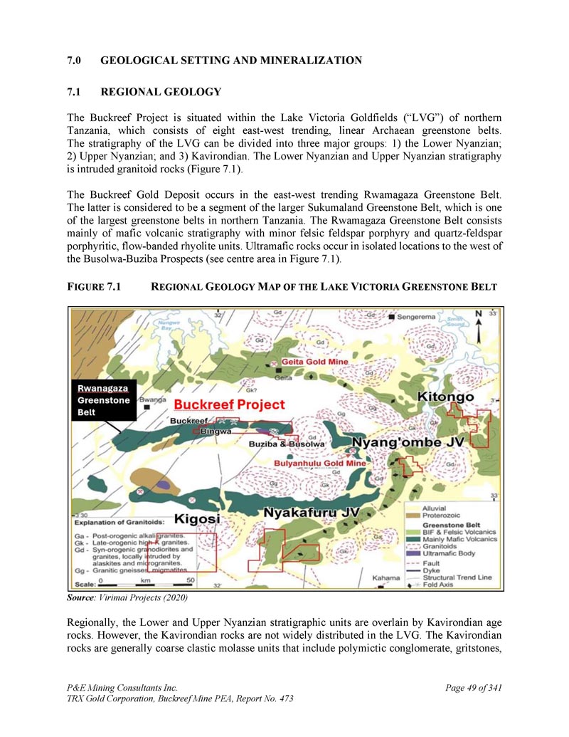1.地质定位和矿化2。区域地质学Buckreef项目位于坦桑尼亚北部的维多利亚湖金矿(“LVG”)内,该地区由八个东西走向的线性太古代绿岩带组成。LVG的地层可分为三大组:1)下Nyanzian;2)上Nyanzian;和3)Kavirondian。下Nyanzian和上Nyanzian地层为侵入花岗岩(图7。1 ) .Buckreef金矿位于东西走向的Rwamagaza绿岩带。后者被认为是更大的Sukumaland绿岩带的一部分,该带是坦桑尼亚北部最大的绿岩带之一。Rwamagaza绿岩带主要由镁铁质火山地层与次长英长石斑岩和石英-长石斑岩、流带流纹岩单元组成。超镁铁质岩石出现在Busolwa-Buziba远景以西的孤立位置(见图7中的中心区域。1 ) .F IGUR7。1 R EGIONAL G EOLOGY M AP of the L AKE V ICTORIA G REENSTONE B ELT资料来源:Virimai Projects(2020)区域上,Nyanzian地层单元的下部和上部被Kavirondian年龄岩石覆盖。然而,Kavirondian岩石在LVG中的分布并不广泛。Kavirondian岩石一般为粗碎屑磨砂单元,包括多晶砾岩、砂石岩、P & E Mining Consultants Inc. TRX Gold Corporation、Buckreef Mine PEA,报告第473期,共341页第49页