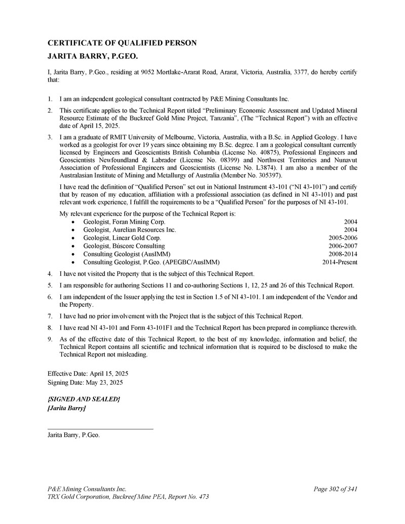 合格人员证书JARITA BARRY,P.GEO。本人,Jarita Barry,P.Geo.,居住于9052 Mortlake-Ararat Road,Ararat,Victoria,Australia,3377,兹证明:1。我是P & E Mining Consultants Inc. 2签约的独立地质顾问。本证书适用于题为“坦桑尼亚Buckreef金矿项目初步经济评估和更新矿产资源估算”的技术报告(“技术报告”),生效日期为2025年4月15日。3.我毕业于澳大利亚维多利亚州墨尔本皇家理工大学,获得应用地质学学士学位。自获得B. SC.学位以来,我作为一名地质学家已经工作了超过19年。我是一名地质顾问,目前获得不列颠哥伦比亚省工程师和地球科学家(许可证编号40875)、专业工程师和地球科学家纽芬兰和拉布拉多(许可证编号08399)以及西北地区和努纳武特专业工程师和地球科学家协会(许可证编号L 3874)。我也是澳大利亚澳大利亚矿业和冶金学会会员(会员编号:305397)。本人已阅读National Instrument 43-101(“NI 43-101”)中对“合格人员”的定义,并证明由于本人的学历、与专业协会的隶属关系(如NI 43-101中的定义)和过去的相关工作经验,本人符合NI 43-101中的“合格人员”要求。就技术报告而言,我的相关经验是:地质学家、Foran Mining Corp.地质学家、Aurelian Resources Inc.地质学家、Linear Gold Corp.地质学家、B ú score Consulting Consulting Geologist(AusIMM)Consulting Geologist、P.Geo。(APEGBC/AusIMM)200420042005-20062006-20072008-20142014-至今4。我没有参观过本技术报告主题的物业。5.本人负责撰写本技术报告第11节和共同撰写第1、12、25和26节。6.我独立于发行人应用NI 43-101第1.5节中的测试。我独立于卖方和物业。7.我之前没有参与过本技术报告主题的项目。8.我已经阅读了NI 43-101和表格43-101F1,技术报告是按照这些标准编写的。9.截至本技术报告生效之日,据本人所知、所知及所信,技术报告载有为使技术报告不具误导性而须予披露的所有科技资料。生效日期:2025年4月15日签署日期:2025年5月23日{签字盖章} [ Jarita Barry ] Jarita Barry,P.Geo。P & E Mining Consultants Inc. TRX Gold Corporation,Buckreef Mine PEA,第473号报告,共341页第302页
