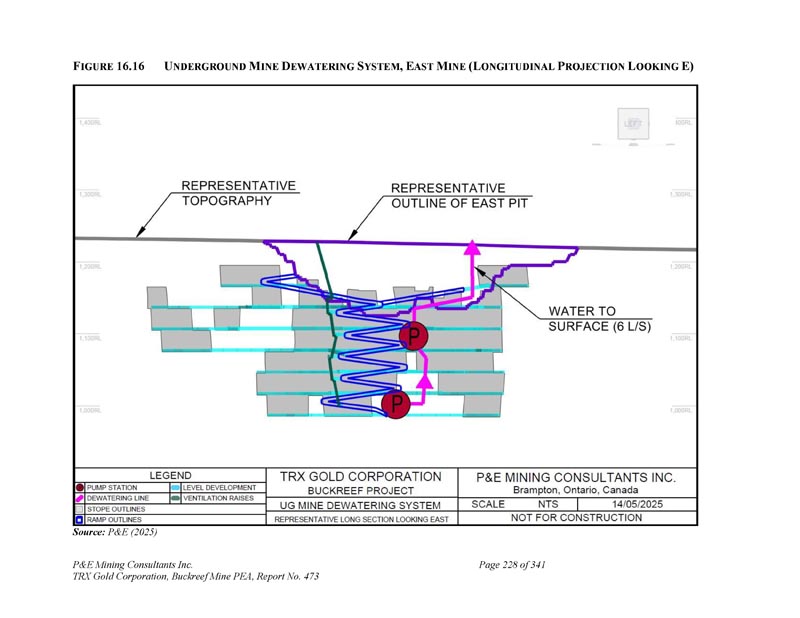 F IGURE 16.16 U NDERGROUND M INE D EWATERING S YTEM,E AST M INE(L ONGITUDINAL P ROJECTION L OOKING E)资料来源:P & E(2025)P & E Mining Consultants Inc. TRX Gold Corporation,Buckreef Mine PEA,第473号报告,共341页第228页