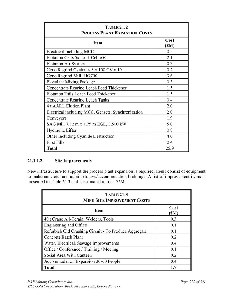 P & E Mining Consultants Inc. TRX Gold Corporation,Buckreef Mine PEA,Report No. 473 Page 272 of 341 T ABLE 21.2 P ROCESS P LANT E XPANSION C OSTS Cost($ M)Item 0.5 Electrical including MCC 2.1 flocation cells 5x tank cell e50 0.3 flocation air system 0.2 conc regrind cyclones 8 x 100 CV x 103.6 conc regrind mill HIG700 0.3絮凝剂混合包1.5精矿再磨浸出饲料增稠器1.5浮选尾料浸出饲料增稠器0.4精矿再磨浸出罐2.04 t AARL洗选厂2.0电气包括MCC、发电机组、同步1.9输送机5.0 SAG磨机7.32 m x 3.75 m EGL,3,500 kW 0.8液压升降机4.0其他包括氰化物破坏0.4首次填充25.9总计21.1.1.2场地改善需要新的基础设施来支持加工厂扩建。项目包括制作混凝土的设备,以及行政/住宿建筑。表21列出了改进项目清单。3,估计总额为200万美元。T ABLE 2130万INE S ITE I MPROVEMENT C OSTS成本(百万美元)项目0.340吨起重机全部-Terain、焊工、工具0.1工程和办公室0.1翻新旧破碎电路-生产骨料0.2混凝土配料厂0.4水、电气、污水改善0.1办公室/会议/培训/会议0.2带食堂的社会面0.4住宿扩建30-60人1.7总计