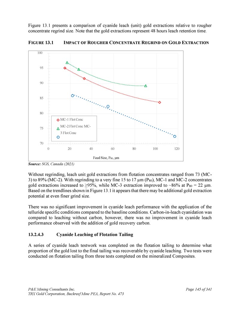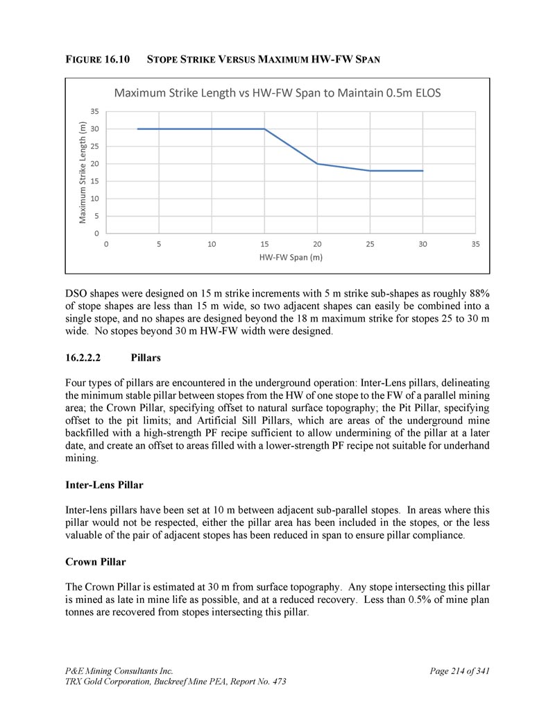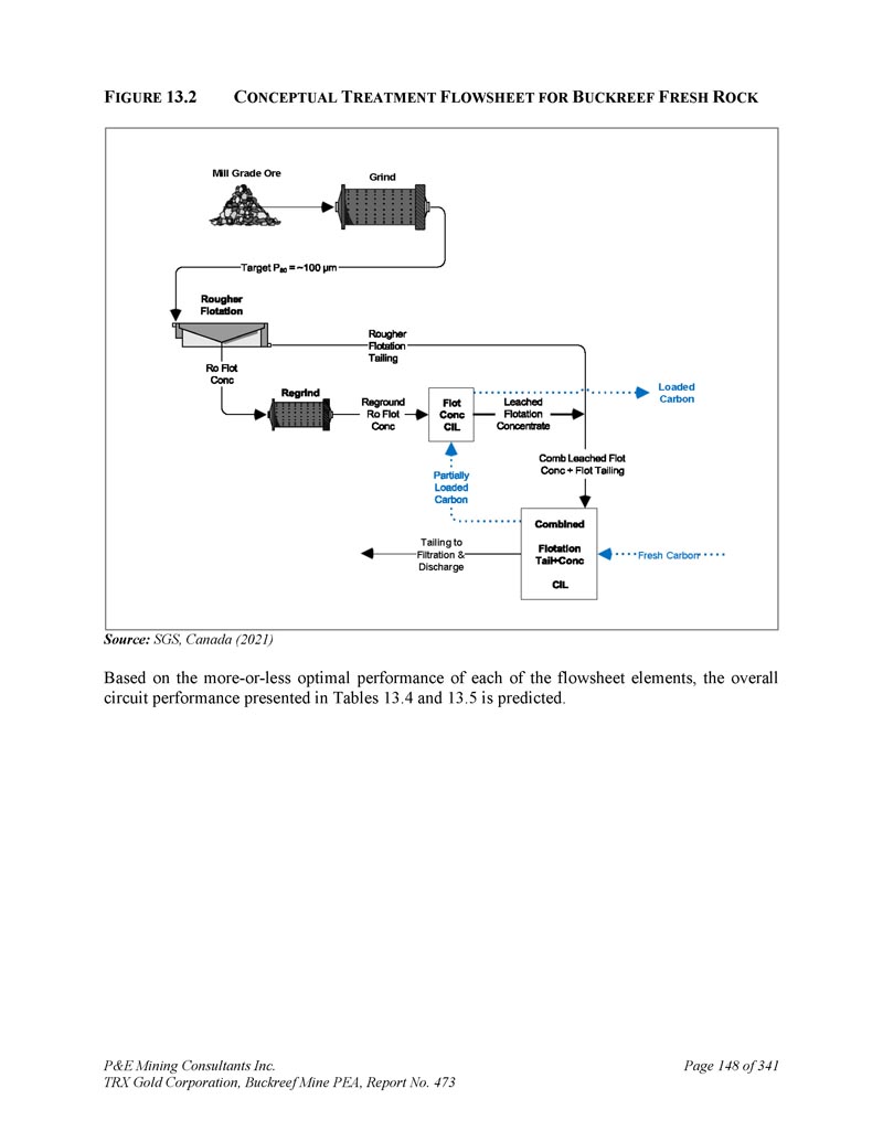P & E Mining Consultants Inc. TRX Gold Corporation,Buckreef Mine PEA,第473号报告,第294页,共34110页。2点8公吨。所含893 koz Au为57 g/t Au。推断矿产资源总计9。1公吨在2。含726 koz金的47 g/t金。测量、指示和推断矿产资源的分类符合CIM(2014)定义标准和最佳做法指南(2019)。本技术报告中报告的更新后的矿产资源估算基于TRX和独立实验室提供的钻探和化验数据,并由作者汇编、验证和验证。钻探数据库由892个钻孔组成,这些钻孔用于创建用于矿产资源估算的136个约束线框。作者认为,目前的钻孔数据库、方法和分析程序对于估算矿产资源是合适的。多数区域仍保持低开低走。进一步钻探可能会提供额外的矿产资源。计划在露天矿生产的前两年,处理率为1,750吨/日,在YR3增加到3,000吨/日。YR 4完成露天采矿。地下开发计划在YR 3开始,并在两年内爬坡,以便到YR 5生产在3000吨/日。一家露天采矿承包商已受聘开采主要和东部斑岩露天矿坑。承包商承担所有钻爆、装载、拖运、矿山设备维护活动。该公司提供全面的矿山管理和技术服务。采矿计划在10米高的长凳上,使用液压挖掘机等常规设备,混合使用20至45吨的运输卡车。矿化材料中的稀释度按吨位估计为18%,按品位估计为15%。露天开采整体带钢比为6。0 : 1 .超过四年的露天矿LOM共3。计划以平均品位1开采5公吨矿化材料。92克/吨金。约为0。8mt低品料0。73克/吨金计划在采矿期间进行储存,并将在项目寿命结束时进行处理。废石将被运送到位于东部斑岩矿坑以东的一个储存设施,矿化材料将被拖到初级破碎机或放置在临时库存中。Buckreef项目地下部分矿化提取将通过长孔次层采,采用胶结浆体回填。所有地下采矿将由承包商完成。整体采矿稀释度估计为26%,采矿回收率估计平均为93%。子级按标称间隔30 m间隔,采场沿走向最大18 m。平均HW-FW跨度为10。1米,60%采场跨度小于8米。纵向回撤采矿涉及沿矿脉走向通过矿化驱动通道到一组采场末端,将用于采场较窄超过13米的地方。计划在采场宽度超过纵向开采的标称13米限制的地方进行横向通路开采。拖运货车一般为50吨,配有10吨和17吨装卸-拖运-倾卸单元。稳态生产3000吨/日(标称1。08mtpa)将在两年的爬坡期后达到,满产将维持近13年。超过我的生命周期(“LOM”),共14。从地下矿山回收矿化物质4公吨,平均品位2。22克/吨金,共含1。02 Moz Au。Buckreef黄金项目正在运营一个加工厂,目前的平均吞吐量为1,439吨/日,与1。21克/吨金头品位,和72。2% AU回收平均。目前的处理设施由两列三级破碎、四台闭路球磨机、十一个碳入浸出(“CIL”)罐,以及用于生产和销售黄金dor é的完整洗脱(少再活化窑)、电积和碳再活化组成。