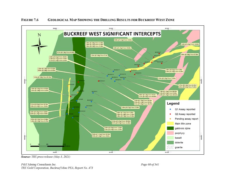 F IGURE 7.6 G EOLOGICAL M AP S HOWING THE D RILLING R ESULTS for B UCKREEF W EST Z ONE来源:TRX新闻稿(2021年5月3日)P & E Mining Consultants Inc. TRX Gold Corporation,Buckreef Mine PEA,第473号报告,共341页第60页