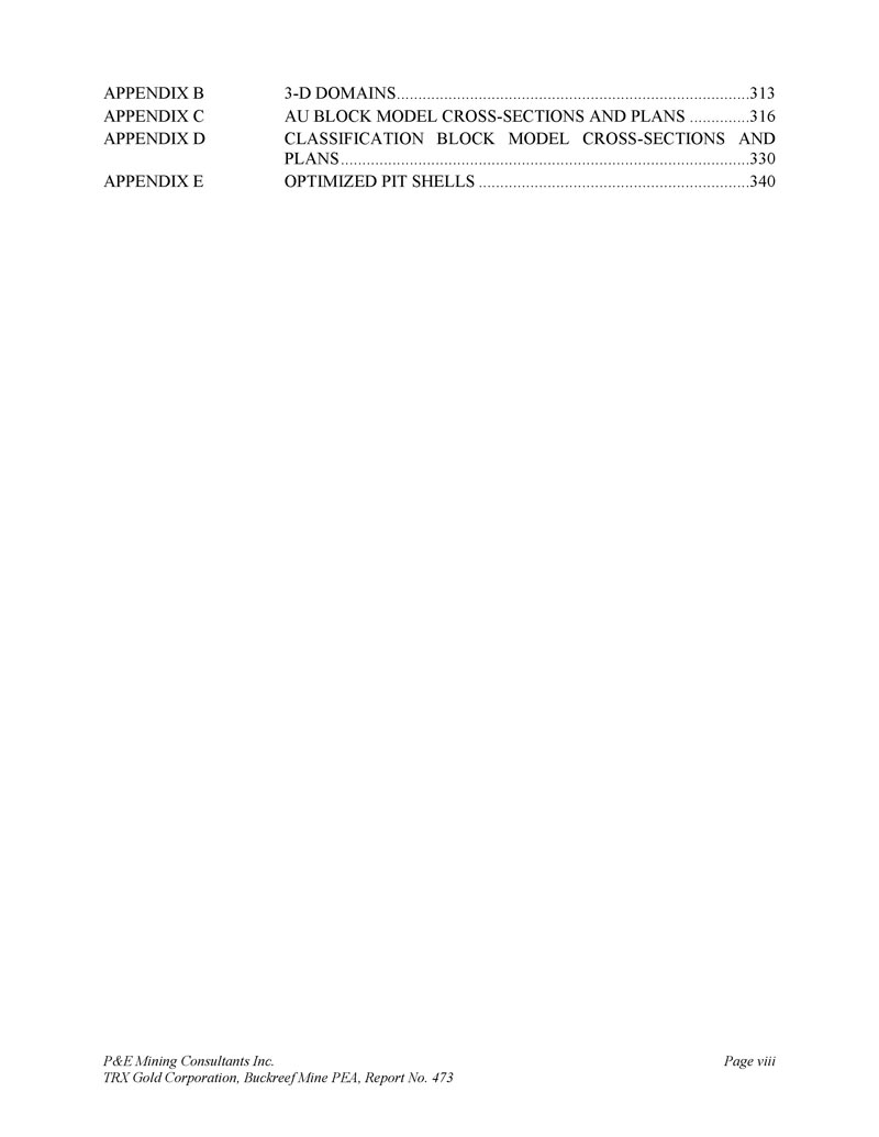 P & E Mining Consultants Inc. TRX Gold Corporation,Buckreef Mine PEA,第473号报告第8页附录B附录C附录D 3-D领域......................................................................3 13个AU块模型交叉-截面和规划......................................................3 16个分类块模型交叉-截面和规划.......................................................................................330个优化的坑壳.......................................................................3 40个附录e