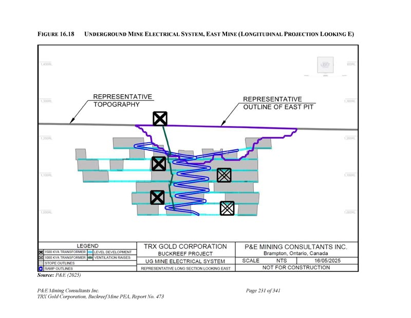 F IGURE 16.18 U NDERGROUND M INE E LECTRICAL S YSTEM,E AST M INE(L ONGITUDINAL P ROJECTION L OOKING E)资料来源:P & E(2025)P & E Mining Consultants Inc. TRX Gold Corporation,Buckreef Mine PEA,第473号报告,共341页第231页
