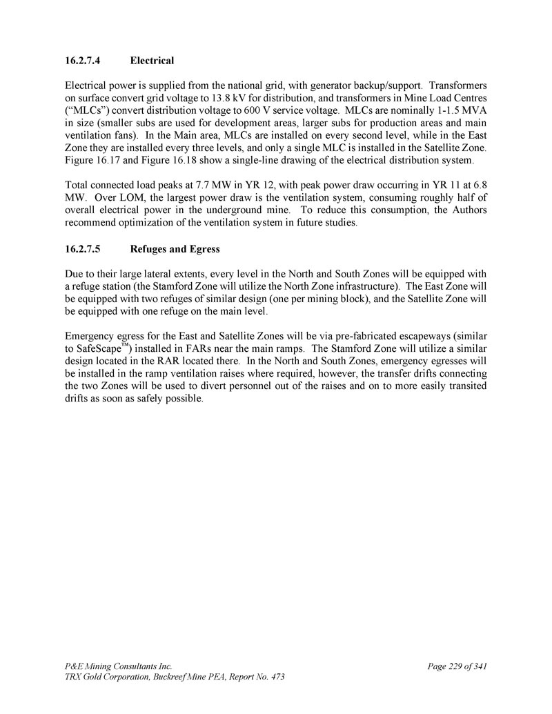 P & E Mining Consultants Inc. TRX Gold Corporation,Buckreef Mine PEA,第473号报告,341年第229页4。电力电力由国家电网供应,有发电机备用/支持。表面上的变压器将电网电压转换为13。8 kV用于配电,矿山负荷中心(“MLC”)中的变压器将配电电压转换为600 V服务电压。MLC名义上是1-1。5兆伏安的尺寸(较小的潜艇用于开发区域,较大的潜艇用于生产区域和主通风风扇)。在主区,MLC每隔一秒级安装一次,而在东区,每隔三级安装一次,在卫星区只安装一次MLC。图16。17和图16。18展示了配电系统的单线绘图。总连接负荷峰值在7。YR12年7兆瓦,峰值电力抽取发生在YR11的6。8兆瓦。在LOM上,最大的电力消耗是通风系统,消耗了地下矿井大约一半的整体电力。为了减少这种消耗,作者建议在未来的研究中优化通风系统。5.避难所和出口由于横向范围较大,南北两区的每一层都将配备一个避难站(斯坦福区将利用北区基础设施)。东区将配备两个类似设计的避难所(每个采矿区块一个),卫星区将在主层配备一个避难所。东部和卫星区的紧急出口将通过预制的逃生通道(类似于SafeScape)安装在主坡道附近的FAR中。斯坦福特区将采用位于那里的RAR的类似设计。在南北两区,需要时将在匝道通风提升中安装应急出口,但将利用连接两区的换乘漂移,尽快安全地将人员从提升中分流到更易换乘的漂移中。