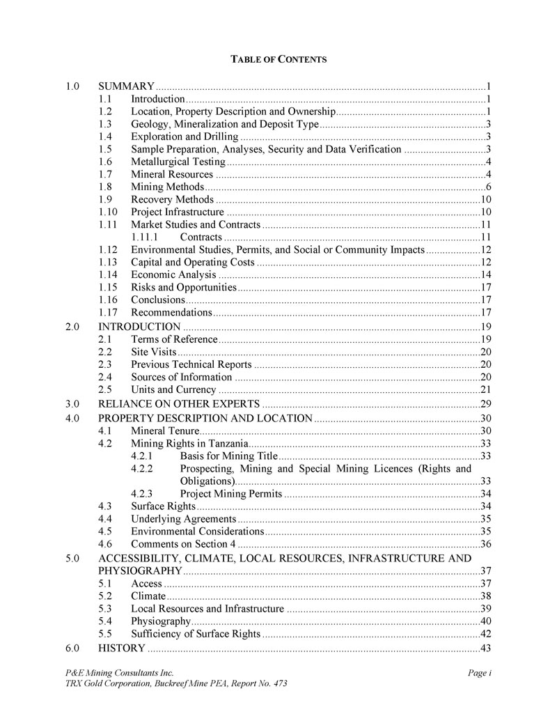 P & E Mining Consultants Inc. TRX Gold Corporation,Buckreef Mine PEA,Report No. 473 page i T ABLE of C ONTENTS 1。总结...................................................................................................................................。1 2.导言......................................................................................................13。位置、财产说明和所有权......................................................1 4。地质、成矿和矿床类型.......................................................................35。勘探和钻探.......................................................................................................3 6。样品制备、分析、安全和数据验证......................................37。冶金检测.......................................................................................48。矿产资源...................................................................................................49。采矿方法...................................................................................................6 10。回收方法.................................................................................................... 10 11。项目基础设施.................................................................................................... 10 12。市场研究和合约.................................................................................... 111。合同......................................................................................................1113。环境研究、许可和社会或社区影响....................12 14。资本和运营成本..................................................................................12 15。经济分析.................................................................................... 14 16。风险与机遇...................................................................................................17 17。结论.................................................................................................... 17 18。建议..................................................................................................17 19。导言.................................................................................................................................... 1920。职权范围.................................................................................................... 1921。实地考察...................................................................................................................2022。历次技术报告...................................................................................2023。信息来源......................................................................................2024。单位和货币......................................................................................................2 13。依赖其他专家......................................................................................294。物业描述及位置.................................................................... 301。矿产保有权....................................................................................................30 2。坦桑尼亚的采矿权.....................................................................................33 4.2.14.2.24.2.3采矿权依据.......................................................................33探矿、采矿和特别采矿许可证(权利和义务).......................................................................33项目采矿许可证......................................................................34 3。表面权利......................................................................................................34 4。基础协议.................................................................................... 355。环境考虑.................................................................................... 356。对第4节的评论...................................................................................................361。无障碍,气候,当地资源, 基础设施和物理图谱...................................................................................................................372。存取...................................................................................................................373。气候...................................................................................................................384。地方资源和基础设施...................................................................................395。生理造影......................................................................................................406。地表权利的充分性......................................................................................4 26.0历史....................................................................................................................43