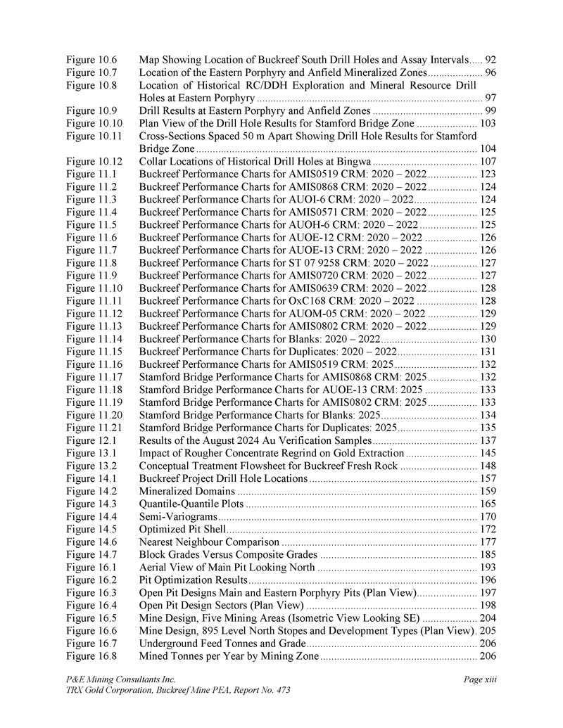 P & E Mining Consultants Inc. TRX Gold Corporation,Buckreef Mine PEA,报告第473页xiii图10.6图10.7图10.8显示Buckreef South钻孔位置和测定间隔的地图....。92东部斑岩和安菲尔德矿化带位置....................96东部斑岩历史RC/DDH勘探和矿产资源钻孔位置..................................................................................97东部斑岩钻探结果和安菲尔德区域......................................99平面图斯坦福大桥区钻孔结果......................10 3个横截面间距50米显示斯坦福大桥区钻孔结果......................................................................................................104个Bingwa历史钻孔的领口位置......................................107个用于AMIS 0519 CRM的Buckreef性能图表:2020 – 2022..................12 3个用于AMIS 0868 CRM的Buckreef性能图表:2020 – 2022..................1 4个用于AUOI的Buckreef性能图表-6个CRM:2020 – 2022.......................124个Buckreef性能图表AMIS 0571 CRM:2020 – 2022..................1 25AUOH-6 CRM的Buckreef性能图表:2020 – 2022..................1 25AUOE-12 CRM的Buckreef性能图表:2020 – 2022...................1 26AUOE-13 CRM的Buckreef性能图表:2020 – 2022...................1 26ST 079258 CRM的Buckreef性能图表:2020 – 2022..................1 27AMIS 0720 CRM的Buckreef性能图表:2020 – 2022..................1 27AMIS 0639 CRM的Buckreef性能图表:2020 – 2022..................1 28Buckreef性能图表对于OxC 168 CRM:2020 – 2022......................AUOM的128个Buckreef性能图表-05CRM:2020 – 2022..................AMIS 0802 CRM的129个Buckreef性能图表:2020 – 2022..................129个Buckreef性能图表用于空白:2020 – 2022...................................130个Buckreef性能图表用于复制品:2020 – 2022......................13 1个Buckreef性能图表用于AMIS 0519 CRM:2025......................13 2个斯坦福桥性能图表用于AMIS 0868 CRM:2025..................13 2个斯坦福桥性能图表对于AUOE-13 CRM:2025...................13 3 AMIS 0802 CRM的斯坦福桥性能图表:2025......................13 3空白部分的斯坦福桥性能图表:2025...................................13 4重复部分的斯坦福桥性能图表:2025.......................13 5 2024年8月AUU验证样品的结果......................................13 7粗精矿再研磨对黄金提取的影响......................14 5概念处理流程表用于Buckreef新鲜岩石....................................148个Buckreef项目钻孔位置......................................................157个矿化域......................................................................................159个分位数-分位数地块......................................................................................................1 65个半-变异函数......................................................................................170个优化坑壳...................................................................................................17 2个最近邻比较......................................................17 7个Block等级与复合等级......................................................185个主坑俯瞰图向北看......................................................193个矿坑优化结果...................................................................................196个露天矿坑设计主坑和东部斑岩矿坑(平面图)......................197个露天矿坑设计板块(平面图)......................................................... 198个矿场设计、五个采矿区(等距观景SE)....................204个矿场 895平北采场及开发类型(平面图)。205地下饲料吨及品位.....................................................................................20 6图10.9图10.10图10.11图10.12图11.1图11.2图11.3图11.4图11.5图11.6图11.7图11.8图11.9图11.10图11.11图11.12图11.13图11.14图11.15图11.16图11.17图11.18图11.19图11.20图11.21图12.1图13.2图14.1图14.2图14.3图14.4图14.6图14.7图16.1图16.2图16.3图16.4图16.5图16.6图16.7图16.8