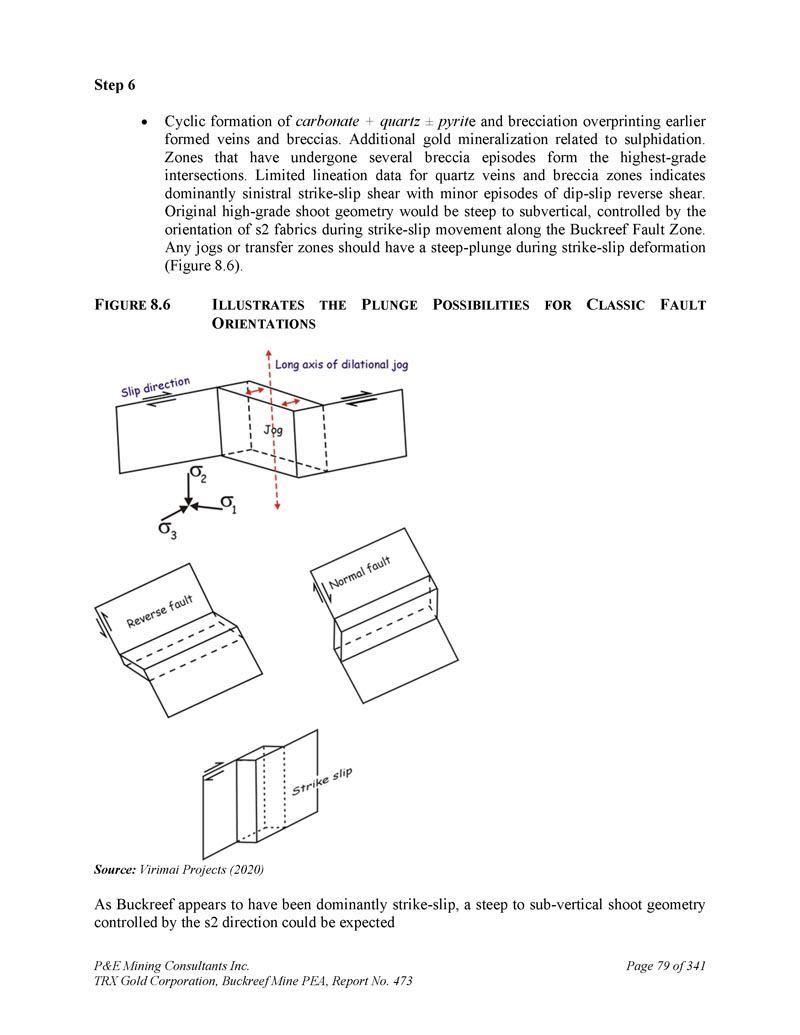 步骤6循环形成碳酸盐+石英“黄铁矿e和角砾化叠印较早形成矿脉和角砾岩。与硫化有关的额外金矿化。经历过几次角砾岩事件的区域形成了最高等级的交叉点。石英脉和角砾岩带的有限线型数据表明,主要是左旋走滑剪切,并伴有轻微的倾滑反剪切事件。原始的高品位枝条几何形状将是陡峭到近垂直的,在沿Buckreef断裂带的走滑运动中受s2织物的方向控制。任何慢跑或转移区域都应该在走滑变形过程中有一个陡坡(图8。6 ) .F IGURE 8.6 I LLUSTRATES P LUNGE P OSSIBIITIES for C LASIC F AULT O RIENTATIONS来源:Virimai Projects(2020)由于Buckreef似乎主要是走滑,可以预期由s2方向控制的陡峭到亚垂直的枝条几何形状P & E Mining Consultants Inc. TRX Gold Corporation,Buckreef Mine PEA,第473号报告,共341页第79页