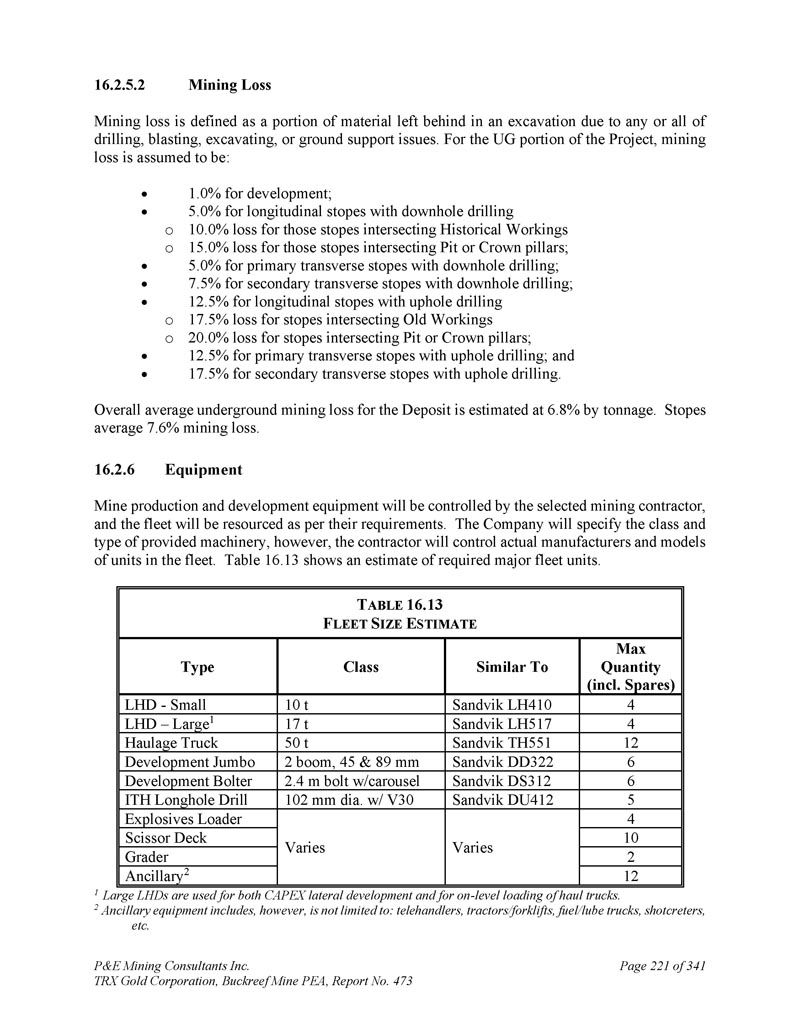 P & E Mining Consultants Inc. TRX Gold Corporation,Buckreef Mine PEA,第473号报告,34116.2.5.2第221页采矿损失采矿损失定义为由于任何或所有钻探、爆破、挖掘或地面支撑问题而在挖掘中留下的部分材料。对于该项目的UG部分,假设采矿损失为:开发为1.0%;井下钻探的纵向采场为5.0% o与历史作业相交的采场为10.0% o与坑或冠柱相交的采场为15.0%;井下钻探的初级横向采场为5.0%;井下钻探的次级横向采场为7.5%;井下钻探的纵向采场为12.5% o与老作业相交的采场为17.5% o与坑或冠柱相交的采场为20.0%;井上钻探的初级横向采场为12.5%;二次横向采场井上钻井17.5%。该矿床的整体平均地下采矿损失估计为6。按吨位计8%。采场平均7。采矿损失6%。16.2.6设备矿山生产和开发设备将由选定的采矿承包商控制,车队将根据其要求获得资源。公司将指定所提供机械的类别和类型,但承包商将控制车队中单位的实际制造商和型号。表16。13显示了所需主要车队单位的估计。T ABLE 16.13 F LEET S IZE E STIMATE最大数量(含Spares)类似于Type4 Sandvik LH410 10 t LHD-Small 4 Sandvik LH517 17 17 t LHD – Large 112 Sandvik TH551 50 t Haulage Truck 6 Sandvik DD322 2 boom,45 & 89 mm Development Jumbo 6 Sandvik DS312 2.4 m bolt w/carousel development bolter 5 Sandvik DU412 102 mm dia. w/v30 ITH Longhole drill 4 varies varies explosives loader 10 scissor deck 2 grader 12 Ancillary 21 large LHD用于CAPEX横向开发和运输卡车的平装。2辅助设备包括但不限于:伸臂搬运机、拖拉机/叉车、燃油/润滑油卡车、喷雾器等。