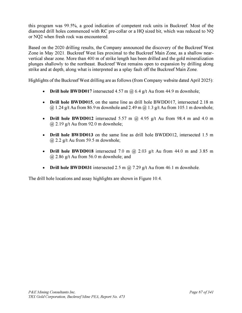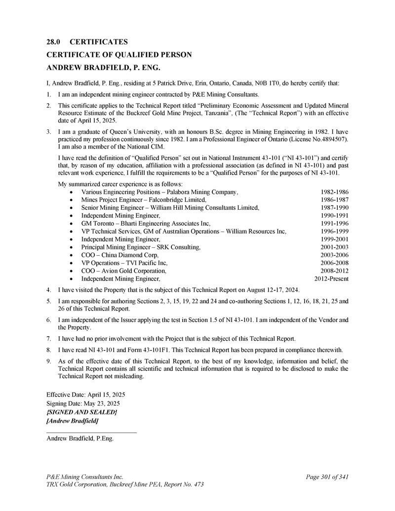 28.0证书合格人员ANDREW BRADFIELD,P. ENG的证书。本人,Andrew Bradfield,P. Eng.,居住在5 Patrick Drive,Erin,Ontario,Canada,N0B 1T0,兹证明:1。我是P & E Mining Consultants签约的独立采矿工程师。2.本证书适用于题为“坦桑尼亚Buckreef金矿项目初步经济评估和更新矿产资源估算”的技术报告(“技术报告”),生效日期为2025年4月15日。3.我是皇后大学的毕业生,1982年获得采矿工程荣誉B. SC.学位。自1982年以来,我一直在不断地练习我的专业。本人为安大略省专业工程师(执业证号4894507)。我也是国家CIM的成员。本人已阅读National Instrument 43-101(“NI 43-101”)中对“合格人员”的定义,并证明,由于本人的学历、与专业协会的隶属关系(如NI 43-101中所定义)和过去的相关工作经验,本人符合NI 43-101中的“合格人员”要求。本人职业经历总结如下:多个工程岗位– Palabora Mining Company,Mines Project Engineer – FalconBridge Limited,Senior Mining Engineer – William Hill Mining Consultants Limited,独立采矿工程师,GM Toronto – Bharti Engineering Associates Inc,技术服务副总裁,澳大利亚运营总经理– William Resources Inc,独立采矿工程师,首席采矿工程师– SRK Consulting,COO – China Diamond Corp,运营副总裁– TVI Pacific Inc,COO – Avion Gold Corporation,独立采矿工程师,1982-1986 1986-1987 1987-1990 1990-1991 1991-1996 1996-1999 1999-2001-2001-2003 2003-2006 2006-20082008-2012-至今4。我已于2024年8月12日至17日访问了本技术报告主题的物业。5.本人负责撰写本技术报告第2、3、15、19、22及24条及共同撰写第1、12、16、18、21、25及26条。6.我独立于发行人应用NI 43-101中第1.5节中的测试。我独立于卖方和物业。7.我之前没有参与过本技术报告主题的项目。8.我已经阅读了NI 43-101和表格43-101F1。本技术报告是根据该报告编写的。9.截至本技术报告生效之日,据本人所知、所知及所信,技术报告载有为使技术报告不具误导性而须予披露的所有科技资料。生效日期:2025年4月15日签署日期:2025年5月23日{签署并盖章} [ Andrew Bradfield ] Andrew Bradfield,P.Eng。P & E Mining Consultants Inc. TRX Gold Corporation,Buckreef Mine PEA,第473号报告,共341页第301页