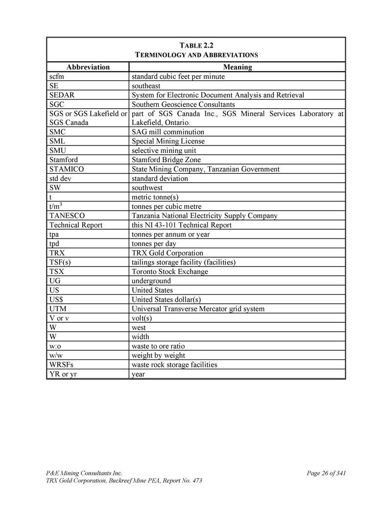P & E Mining Consultants Inc. TRX Gold Corporation,Buckreef Mine PEA,Report No. 473 Page 26 of 341 T ABLE 2.2 T ERMINOLOGY and a BBREVIONS meaning abbreviations for electronic document analysis and retrieval SEDAR Southern Geoscience Consultants SGS Canada Inc.的SEDAR Southern Geoscience System,SGS Mineral Services Laboratory at Lakefield,Ontario。SGS或SGS Lakefield或SGS Canada SAG mill comminution SMC特殊采矿许可证SML选择性采矿单元SMU Stamford Bridge Zone Stamford State Mining Company,坦桑尼亚政府STAMICO标准偏差std dev西南SW公吨吨吨每立方米t/m 3坦桑尼亚国家电力供应公司TANESCO本NI 43-101技术报告技术报告吨每年或年tpa吨每天tpa吨tpd TRX Gold Corporation TRX尾矿储存设施(设施)TSF(s)多伦多证券交易所TSX地下UG美国美元(s)美元通用横向墨卡托电网系统UTM伏特V或v西W宽W废矿石比w:o重量计w/w废石储存设施WRSFs年YR或YR