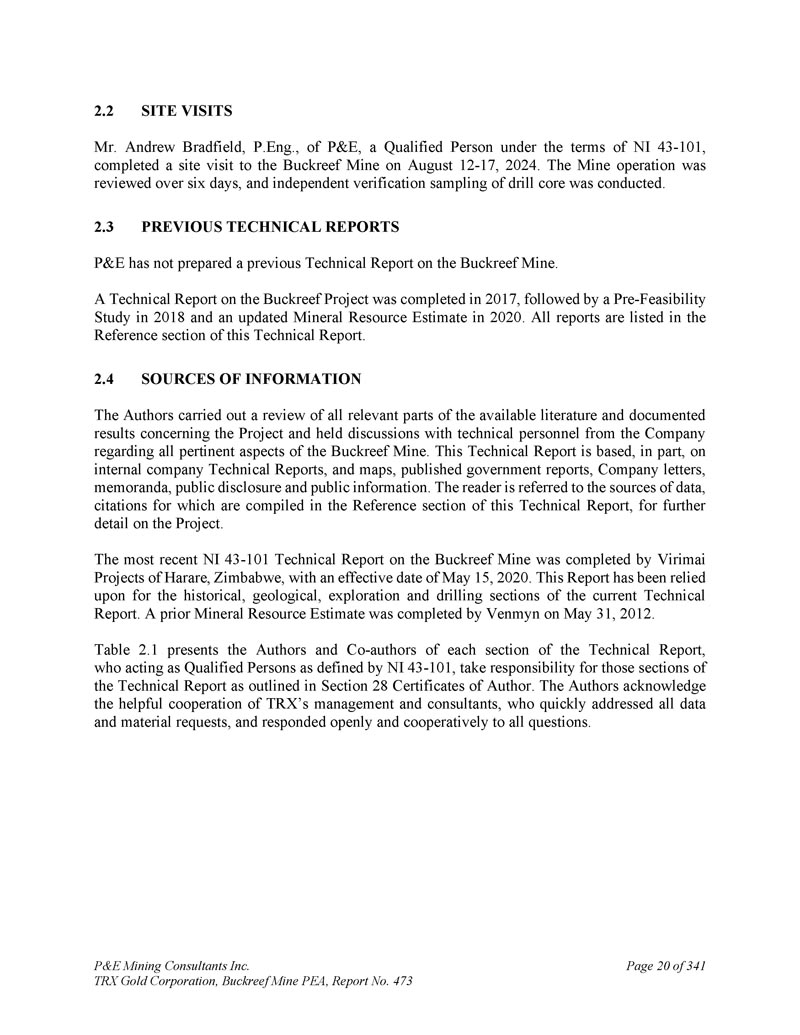 P & E Mining Consultants Inc. TRX Gold Corporation,Buckreef Mine PEA,报告第473期,共3412页。现场访问Andrew Bradfield先生,P. Eng。,of P & E,a qualified person under the terms of NI 43-101,completed a site visit to the Buckreef mine on August 12-17,2024。对矿山作业进行了为期六天的审查,并对钻芯进行了独立验证取样。3.先前的技术报告P & E没有编写关于Buckreef矿的先前技术报告。Buckreef项目的技术报告于2017年完成,随后于2018年进行了预可行性研究,并于2020年更新了矿产资源估算。所有报告均列于本技术报告的参考部分。4.信息来源作者对有关该项目的现有文献和记录结果的所有相关部分进行了审查,并就Buckreef矿的所有相关方面与公司的技术人员进行了讨论。这份技术报告部分基于公司内部技术报告,以及地图、已发布的政府报告、公司信函、备忘录、公开披露和公开信息。请读者参考数据来源,其引用汇编于本技术报告的参考部分,以了解有关该项目的更多详细信息。关于Buckreef矿的最新NI 43-101技术报告由津巴布韦哈拉雷的Virimai项目完成,生效日期为2020年5月15日。当前技术报告的历史、地质、勘探和钻井部分均依赖此报告。Venmyn于2012年5月31日完成了先前的矿产资源估算。表2。1介绍了技术报告每个部分的作者和共同作者,他们作为NI 43-101定义的合格人员,对技术报告的第28节作者证书中概述的那些部分负责。作者感谢TRX的管理层和顾问的有益合作,他们迅速处理了所有数据和材料请求,并公开合作地回答了所有问题。