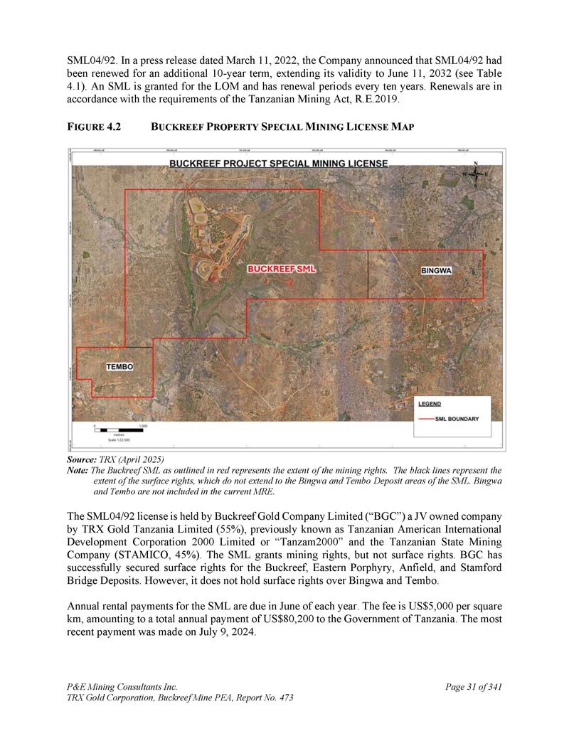 SML 04/92。在日期为2022年3月11日的新闻稿中,公司宣布SML 04/92已获额外续期10年,将其有效期延长至2032年6月11日(见表4。1 ) .为LOM授予SML,每十年有一次续约期。续展符合《坦桑尼亚矿业法》(R. E. 2019)的要求。F IGUR4。2 b UCKREEF P ROPERTY S PECIAL M INING L ICENSE M AP来源:TRX(2025年4月)注:以红色勾勒出的Buckreef SML代表采矿权的范围。黑色线条代表地表权利的范围,不延伸至SML的Bingwa和Tembo矿床区域。Bingwa和Tembo不包括在当前的MRE中。SML 04/92许可证由Buckreef Gold Company Limited(“BGC”)持有,该公司是TRX Gold Tanzania Limited(55%)(以前称为Tanzanian American International Development Corporation 2000 Limited或“Tanzam 2000”)和坦桑尼亚国家矿业公司(STAMICO,45%)拥有的合资公司。SML授予采矿权,但不授予地表权。BGC已成功获得Buckreef、Eastern Porphyry、Anfield和Stamford Bridge矿床的地表权利。然而,它并不对Bingwa和Tembo拥有表面权利。SML的年度租金付款将于每年6月到期。费用为每平方公里5000美元,相当于每年向坦桑尼亚政府支付80,200美元。最近一次付款是在2024年7月9日。P & E Mining Consultants Inc. TRX Gold Corporation,Buckreef Mine PEA,报告第473页,共341页
