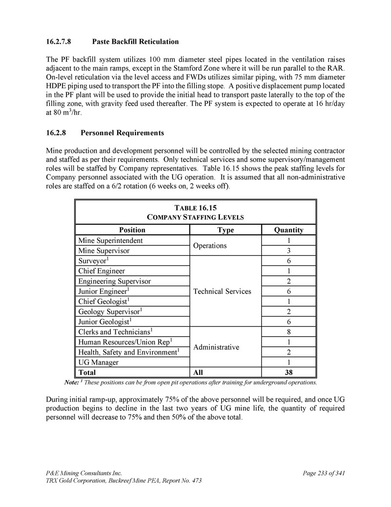 P & E Mining Consultants Inc. TRX Gold Corporation,Buckreef Mine PEA,报告第473号,34116.2.7.8第233页粘贴回填网状PF回填系统使用直径为100毫米的钢管,该钢管位于与主坡道相邻的通风隆起处,但斯坦福特区除外,在那里它将与RAR平行运行。通过水平通道和FWD的水平网状结构使用类似的管道,直径75毫米的HDPE管道用于将PF输送到充填场。位于PF工厂的正排量泵将用于提供初始头,以横向将浆料输送到灌装区的顶部,随后使用重力进料。预计PF系统运行时间为16小时/天,时速为80米3/小时。16.2.8人员要求矿山生产开发人员由选定的采矿承包人控制,按要求配备人员。只有技术服务和一些监督/管理角色将配备公司代表。表16。15显示了与UG操作相关的公司人员的峰值人员配置水平。假设所有非行政职务的工作人员按6/2轮换(6周开始,2周休息)。T ABLE 16.15 C OMPANY S TAFFING L EVELS数量类型职位1作业矿山主管3矿山主管6技术服务测量师11总工程师2工程主管6初级工程师11总地质师12地质主管16初级地质师18行政文员和技术员11人力资源/工会代表12健康、安全和环境11 UG经理38全部合计注:1这些岗位经井下作业培训后,可从露天矿场作业中提取。在最初的爬坡-上马期间,将需要大约75%的上述人员,而一旦在最近两年的UG矿山寿命中,UG产量开始下降,所需人员数量将减少到上述总数的75%,然后是50%。
