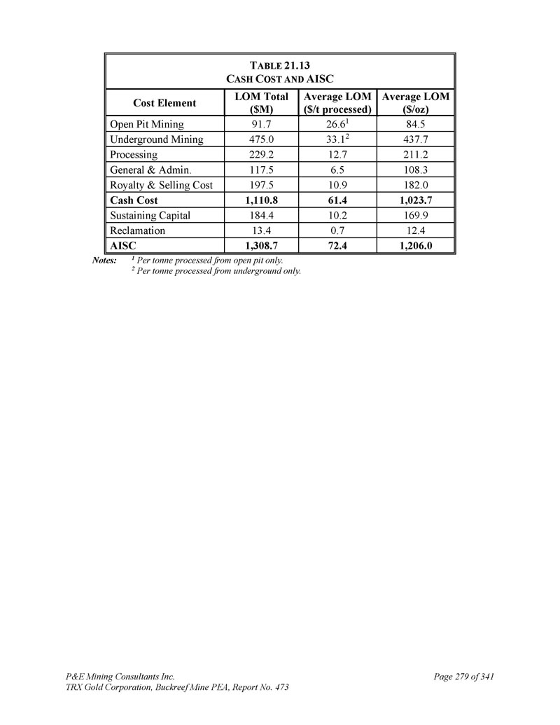 P & E Mining Consultants Inc. TRX Gold Corporation,Buckreef Mine PEA,Report No. 473 Page279 of 341 T ABLE 21.13 C ASH C OST和AISC Average LOM($/oz)Average LOM($/t processed)LOM total($ m)成本要素84.5 26.6 191.7露天采矿437.73 3.12 475.0地下采矿211.21 2.72 29.2处理108.36.51 17.5 General & Admin. 18 2.0 10.9 197.5版税和销售成本1,0 23.76 1.41,110.8现金成本169.9 10.2184.4维持资本12.4 0.71 3.4回收1,206.07 2.41,308.7 AISC注:每吨仅从露天矿处理1。2每吨仅从地下处理。