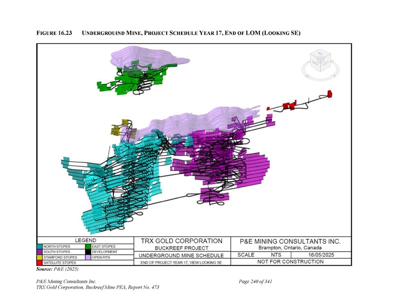 F IGURE 16.23 U NDERGROUIN M INE,P ROJECT S CHEDULE Y EAR 17,E ND of LOM(L OOKING SE)资料来源:P & E(2025)P & E Mining Consultants Inc. TRX Gold Corporation,Buckreef Mine PEA,第473号报告,共341页第240