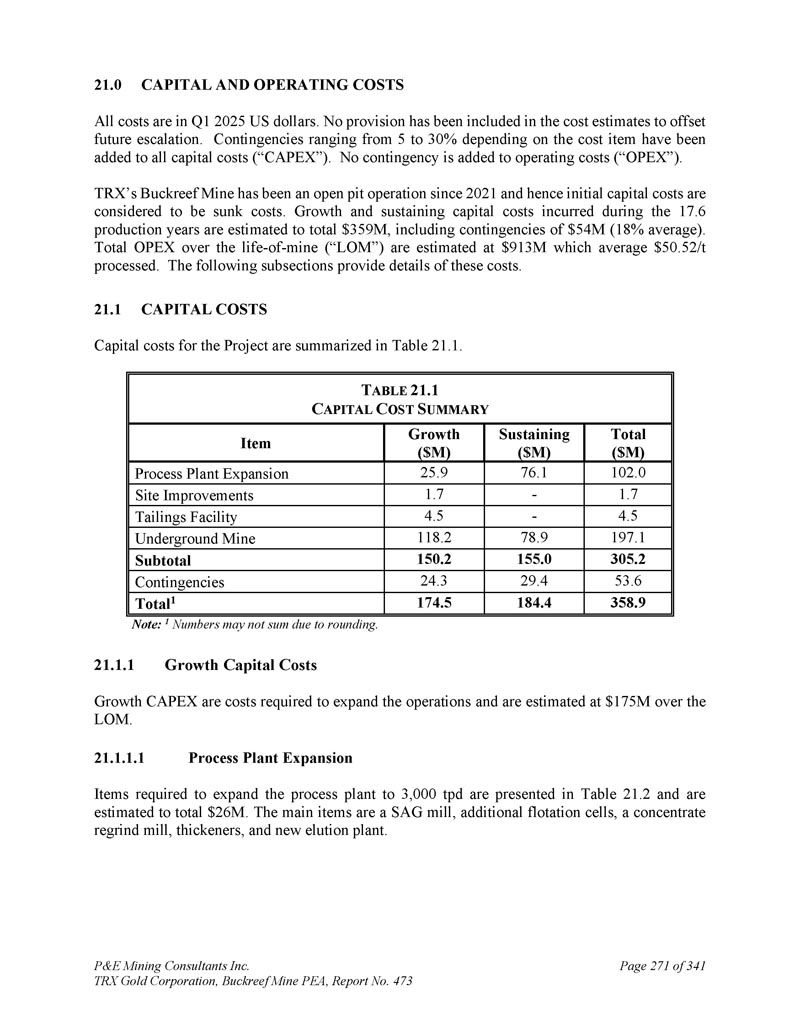 P & E Mining Consultants Inc. TRX Gold Corporation,Buckreef Mine PEA,第473号报告,共3411页271。资本和运营成本所有成本在Q12025美元。成本估算中没有包括任何拨备以抵消未来的升级。所有资本成本(“CAPEX”)中都增加了根据成本项目从5%到30%不等的或有事项。运营成本(“OPEX”)中不增加任何或有事项。自2021年以来,TRX的Buckreef矿一直是露天开采,因此初始资本成本被视为沉没成本。增长和维持资本成本在17日期间发生。6个生产年度估计总额为3.59亿美元,包括5400万美元的或有事项(平均18%)。矿山生命周期(“LOM”)的总运营成本估计为9.13亿美元,平均为50美元。52/t处理。以下小节提供了这些费用的详细信息。1.资本成本项目的资本成本汇总于表21。1 .T ABLE 21.1 C APITAL C OST总汇($ M)持续($ M)增长($ M)项目102.076.125.9加工厂扩建1.7-1.7场地改善4.5-4.5尾矿设施197.17 8.91 18.2地下矿山305.2 155.01 50.2小计53.62 9.424.3或有事项358.9 184.41 74.5合计1注:1由于四舍五入,数字可能未加总。1.增长资本成本增长资本支出是扩大业务所需的成本,估计比LOM高出1.75亿美元。1.流程工厂扩建至3000吨/日所需的流程工厂扩建项目列于表21。2个,估计总额为2600万美元。主要项目是SAG磨机、额外的浮选槽、精矿回磨机、浓缩机和新的洗脱厂。