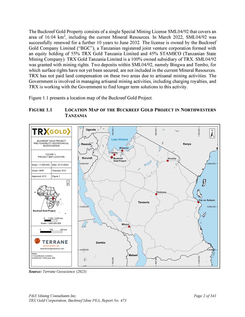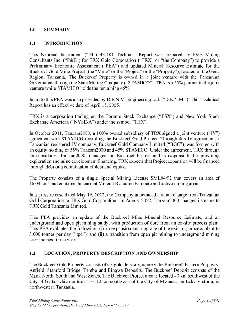 P & E Mining Consultants Inc. TRX Gold Corporation,Buckreef Mine PEA,第473号报告,共3411页。摘要2。本National Instrument(“NI”)43-101技术报告由P & E Mining Consultants Inc.(“P & E”)为TRX黄金公司(“TRX”或“本公司”)编制,目的是为位于坦桑尼亚Geita地区的Buckreef金矿项目(“矿山”或“项目”或“财产”)提供初步经济评估(“PEA”)和更新的矿产资源估算。Buckreef资产通过国家矿业公司(“STAMICO”)与坦桑尼亚政府合资拥有。TRX是合资公司中55%的合作伙伴,STAMICO持有剩余的45%。该PEA的输入也由D. E. N. M. Engineering Ltd.(“D. E. N. M.”)提供。本技术报告生效日期为2025年4月15日。TRX是一家在多伦多证券交易所(“TSX”)和纽约证券交易所美国证券(“NYSE-A”)交易的公司,交易代码为“TRX”。2011年10月,TRX 100%拥有的子公司Tanzam 2000与STAMICO就Buckreef黄金项目签署了合资(“JV”)协议。通过该合资协议,组建了坦桑尼亚注册合资公司Buckreef Gold Company Limited(“BGC”),持股55% Tanzam 2000和45% STAMICO。根据协议,TRX通过其子公司Tanzam 2000管理Buckreef项目并负责提供勘探和矿山开发融资。TRX预计,项目扩建将通过债务或债务和股权相结合的方式融资。该物业由一张特殊采矿许可证SML 04/92组成,面积为16.04 km 2,包含当前的矿产资源估算和活跃矿区。在2022年5月16日的新闻稿中,该公司宣布将名称从Tanzanian Gold Corporation更改为TRX黄金公司。2022年8月,Tanzam 2000更名为TRX Gold Tanzania Limited。该PEA提供了Buckreef矿山矿产资源估算的更新,以及地下和露天采矿研究,并从现场工艺工厂生产了dor é。这份PEA评估如下:(i)将现有加工厂扩建和升级至每天3000吨(“tpd”);(ii)在未来三年内从露天采矿过渡到地下采矿。1.2位置、财产描述和所有权Buckreef金矿财产由六个金矿组成,分别是Buckreef、Eastern Porphyry、Anfield、Stamford Bridge、Tembo和Bingwa矿床。Buckreef矿床由主要、北部、南部和西部区域组成。Buckreef项目区位于盖塔市西南40公里处,而盖塔市又位于姆万扎市西南约110公里处,位于坦桑尼亚西北部的维多利亚湖上。
