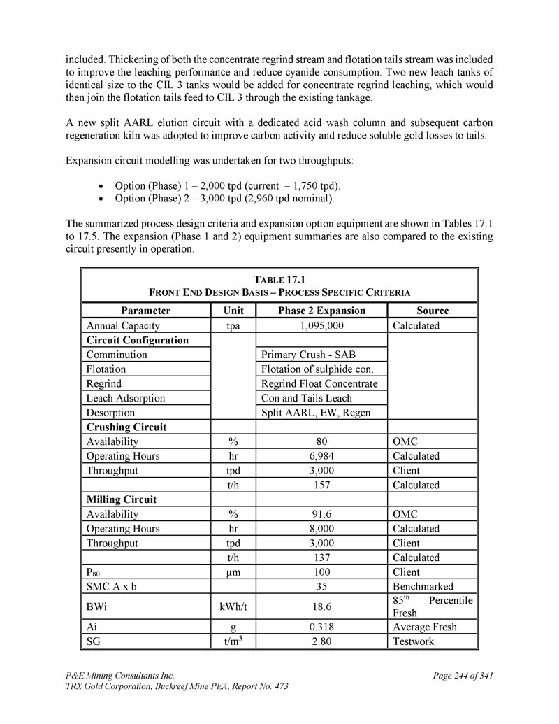 P & E Mining Consultants Inc. TRX Gold Corporation,Buckreef Mine PEA,第473号报告,共341页第244页。包括精矿回磨流和浮选尾流的加厚,以提高浸出性能,减少氰化物消耗。将增加两个与CIL 3槽大小相同的新浸出池用于精矿回磨浸出,然后该浸出池将通过现有罐体将浮选尾料加入到CIL 3中。采用新的分体式AARL洗脱回路,配有专用酸洗柱和后续碳再生窑,提高了碳活性,减少了可溶性金对尾部的损失。对两个吞吐量进行了扩展电路建模:选项(阶段)1 – 2,000吨/日(当前– 1,750吨/日)。期权(阶段)2 – 3,000吨/日(名义2,960吨/日)。汇总的工艺设计准则和扩展选项设备见表17。1比17。5 .扩建(1期和2期)设备概要也与目前运行的现有电路进行了比较。T ABLE 17.1 F RONT E ND D ESIGN B ASIS – P ROCESS S PECIFIC C RITERIA Source Phase 2 Expansion Unit Parameter calculated 1,095,000 tpa annual capacity circuit configuration primary crush-SAB comminution flocation of sulphide con。浮选再研浮法精矿再研磨Con和Tailleach浸出吸附分裂AARL、EW、Regen解吸破碎电路OMC 80%可用性计算6,984小时工作小时客户端3,000吨/日吞吐量计算157 t/h铣削电路OMC 91.6%可用性计算8,000小时工作小时客户端3,000吨/日吞吐量计算137 t/h客户端100 μ m p 80基准35 SMC A x b第85个百分位新鲜18.6 kWh/t BWi平均新鲜0.318 g AI测试工作2.80 t/m 3 SG