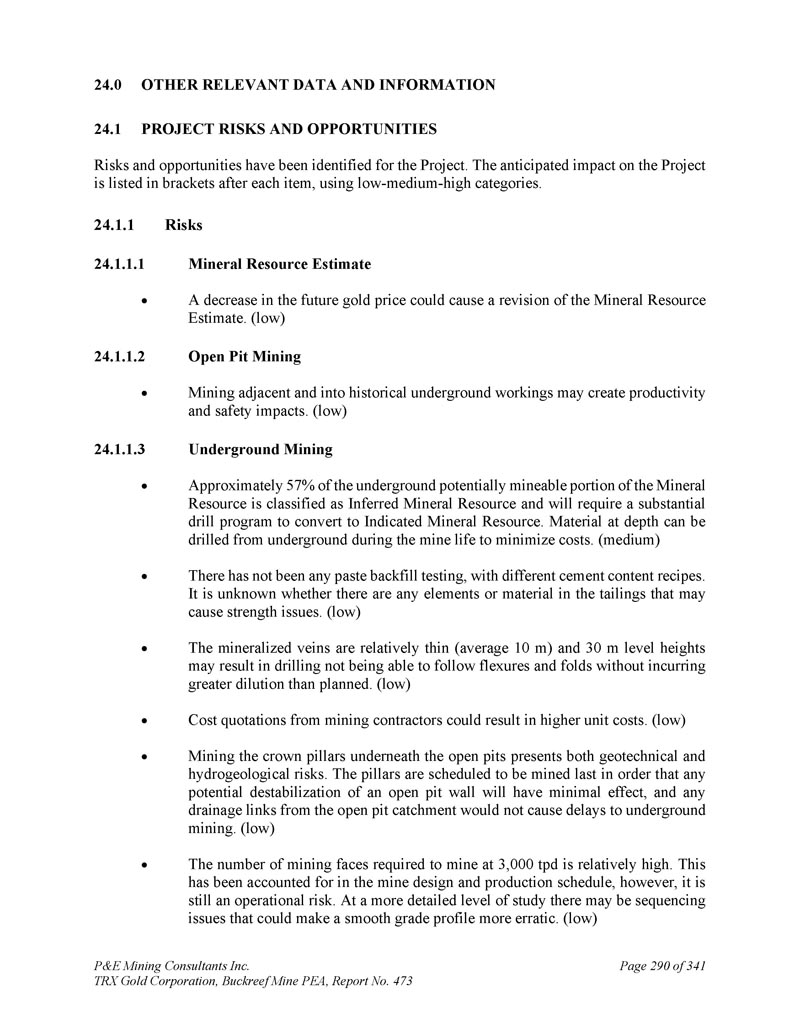 P & E Mining Consultants Inc. TRX Gold Corporation,Buckreef Mine PEA,第473号报告,共3411页第290页。其他相关数据和信息2。已为该项目确定了项目风险和机会风险和机会。对项目的预期影响列在每项之后的括号中,使用低-中-高类别。1.风险1。矿产资源估算未来金价下跌可能导致矿产资源估算修正。(低)24.1.1.2露天采矿邻近和进入历史地下作业可能会产生生产力和安全影响。(低)24.1. 1.3地下采矿矿产资源的地下潜在可开采部分中约有57%被归类为推断矿产资源,将需要大量的钻探计划才能转换为指示矿产资源。在矿山寿命期间,可以从地下钻探深度材料,以最大限度地降低成本。(中)没有进行过任何膏体回填检测,不同的水泥含量配方。目前尚不清楚尾矿中是否存在可能导致强度问题的元素或物质。(低)矿化矿脉相对较薄(平均10米)和30米的水平高度可能导致钻探无法跟随弯曲和褶皱而不会产生比计划更大的稀释。(低)采矿承包商的成本报价可能会导致更高的单位成本。(低)开采露天矿坑下的冠柱,既有岩土工程风险,也有水文地质风险。这些柱子计划最后开采,以便露天矿壁的任何潜在不稳定都将产生最小的影响,并且露天矿集水区的任何排水环节都不会导致地下采矿的延误。(低)3000吨/日开采所需采面数量较高。这在矿山设计和生产计划中已经考虑在内,然而,它仍然是一个操作风险。在更详细的研究层面上,可能存在排序问题,这可能会使平滑的等级概况更加不稳定。(低)