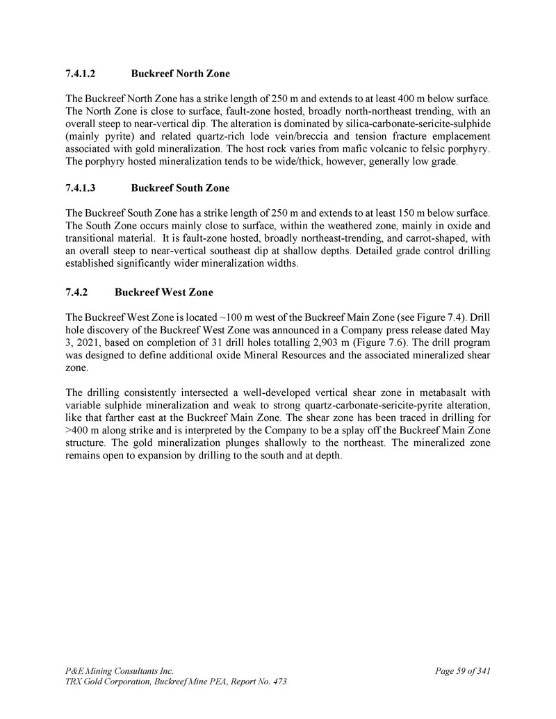 P & E Mining Consultants Inc. TRX Gold Corporation,Buckreef Mine PEA,第473号报告,共3412页,第59页。Buckreef北区Buckreef北区走向长度为250米,延伸至地表以下至少400米。北区靠近地表,断裂带为主,大致呈北-东北走向,整体陡峭至近垂直倾角。蚀变以二氧化硅-碳酸盐-绢云母-硫化物(主要为黄铁矿)和相关的富石英脉脉/角砾岩及与金矿化伴生的张拉断裂位错为主。主岩由镁铁质火山岩到长英质斑岩岩不等。斑岩承载的矿化倾向于宽/厚,然而,通常低品位。3.Buckreef南区Buckreef南区走向长度为250米,延伸至地表以下至少150米。南区主要发生在靠近地表的地方,在风化带内,主要发生在氧化物和过渡性物质中。断裂带为主,大致呈东北走向,呈胡萝卜形,浅水处整体陡峭至近垂直东南倾角。详细的品位控制钻探建立了明显更宽的矿化宽度。7.4.2 Buckreef西区Buckreef西区位于Buckreef主区以西~100 m(见图7。4 ) .Buckreef西区的钻孔发现是在2021年5月3日的公司新闻稿中宣布的,基于31个钻孔的完成,总计2,903 m(图7。6 ) .该钻探计划旨在确定额外的氧化物矿产资源和相关的矿化剪切带。此次钻探始终与变质玄武岩中一个发育良好的垂直剪切带相交,该带具有可变的硫化物矿化和弱到强的石英-碳酸盐-绢云母-黄铁矿蚀变,就像在Buckreef主带更远的东部。剪切带已在沿走向超过400米的钻探中被追踪到,该公司将其解释为Buckreef主带结构的展开。金矿化向东北浅陷。矿化带仍然开放,可以通过向南钻探和在深度进行扩张。