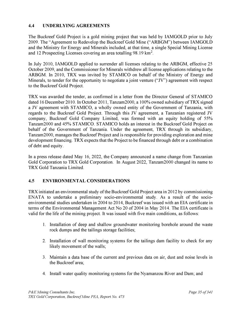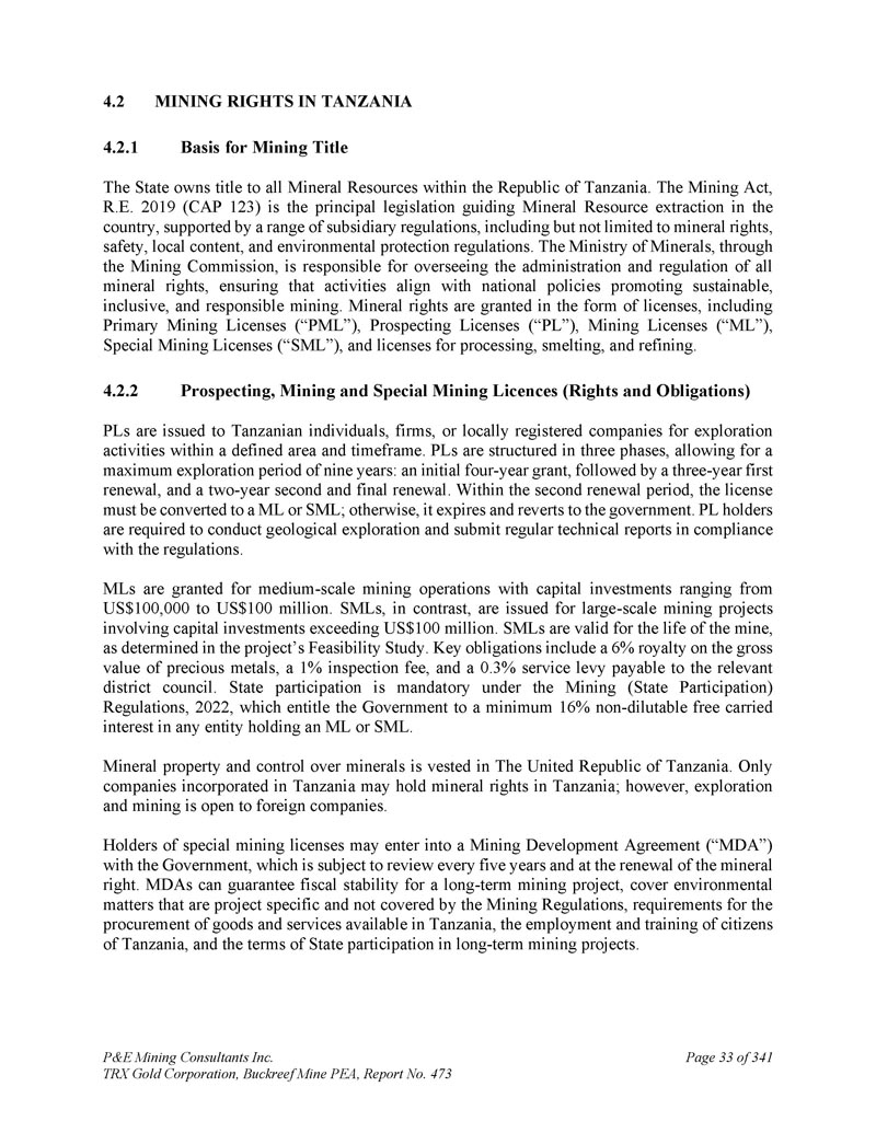 P & E Mining Consultants Inc. TRX Gold Corporation,Buckreef Mine PEA,第473号报告,共3412页第33页。坦桑尼亚的采矿权1。采矿权依据国家拥有坦桑尼亚共和国境内所有矿产资源的所有权。The Mining Act,R.E. 2019(CAP123)是指导该国矿产资源开采的主要立法,得到一系列附属法规的支持,包括但不限于矿权、安全、当地含量和环境保护法规。Minerals部通过矿业委员会负责监督所有矿权的管理和监管,确保活动符合促进可持续、包容和负责任采矿的国家政策。矿业权以许可证形式授予,包括初级采矿许可证(“PML”)、探矿许可证(“PL”)、采矿许可证(“ML”)、特殊采矿许可证(“SML”),以及加工、冶炼和精炼许可证。2.探矿、采矿和特殊采矿许可证(权利和义务)PLs发给坦桑尼亚个人、公司或在当地注册的公司,用于在规定的区域和时间范围内开展勘探活动。PLS分为三个阶段,允许最长九年的勘探期:最初的四年赠款,然后是三年的第一次续签,以及两年的第二次和最后一次续签。在第二个续展期限内,许可证必须转换为ML或SML;否则,到期并归还给政府。PL持有人须按规定进行地质勘探并提交定期技术报告。MLs被授予用于中等规模的采矿作业,资本投资从10万美元到1亿美元不等。相比之下,SML是为涉及资本投资超过1亿美元的大型矿业项目发行的。SML在矿山寿命内有效,项目可行性研究确定。关键义务包括贵金属总价值6%的特许权使用费、1%的检验费和0。须向有关区议会缴付3%的服务征费。根据2022年《采矿(国家参与)条例》,国家参与是强制性的,该条例赋予政府在持有ML或SML的任何实体中至少16%的不可稀释自由附带权益的权利。矿产财产和对矿产的控制权归属坦桑尼亚联合共和国。只有在坦桑尼亚注册成立的公司才能持有坦桑尼亚的矿产权;不过,勘探和开采对外国公司开放。特别采矿许可证持有人可与政府订立采矿开发协议(“MDA”),该协议每五年进行一次审查,并在矿权续期时进行。MDAs可以保证长期采矿项目的财政稳定,涵盖项目特定且《采矿条例》未涵盖的环境事项、采购坦桑尼亚可用商品和服务的要求、坦桑尼亚公民的就业和培训,以及国家参与长期采矿项目的条款。