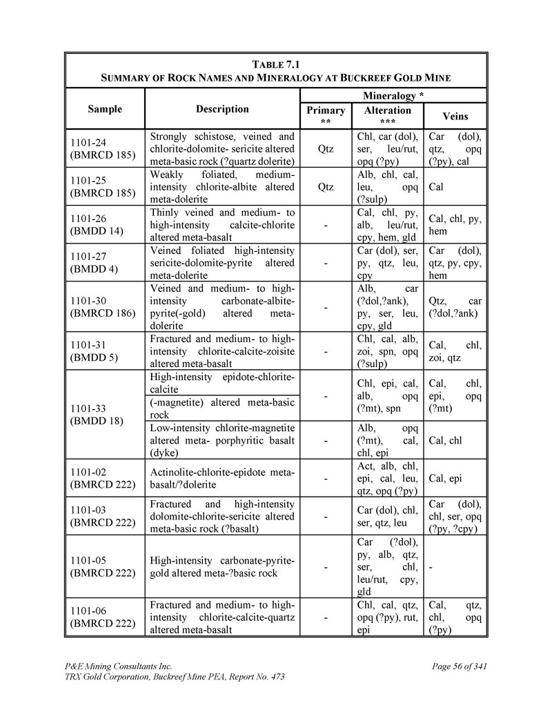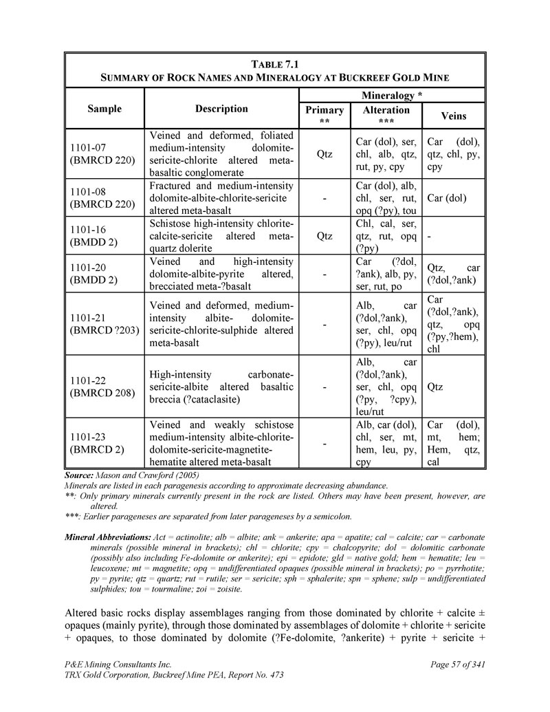 P & E Mining Consultants Inc. TRX Gold Corporation,Buckreef Mine PEA,Report No. 473 Page 56 of 341 T ABLE 7.1 S Ummary of R OCK N AMES and M INERALOGY at B UCKREEF G OLD M INE Mineralogy*说明样本静脉改变***初级**Car(dol),qtz,opq(?py),cal Chl,car(dol),ser,leu/rut,opq(?py)qtz强片岩,脉状和绿泥石-白云石-绢云母蚀变-基性岩(?石英辉绿岩)1101-24(BMRCD 185)cal alb,chl,cal,leu,opq(?sulp)qtz弱叶状,中强度绿泥石-钠长石蚀变间-辉绿岩1101-25(BMRCD 185)Cal,Chl,py,hem Cal,Chl,py,alb,leu/rut,cpy,hem,gld-细脉和中至高强度方解石-绿泥石蚀变间-玄武岩1101-26(BMDD 14)Car(dol),qtz,py,cpy,hem Car(dol),ser,py,qtz,leu,cpy-脉状叶状高强度绢云母-白云石-黄铁矿蚀变间-辉绿岩1101-27(BMDD 4)Qtz,car(?dol,?ank)Alb,car(?dol,GLD-脉状和中至高强度碳酸盐-钠长石-黄铁矿(-金)蚀变变质-辉绿岩1101-30(BMRCD 186)CHL,Cal,Zoi,qtz Chl,cal,alb,zoi,spn,opq(?sulp)-断裂和中至高强度绿泥石-方解石-zoisite蚀变变质-玄武岩1101-31(BMDD 5)chl,opq Cal,epi,(?mt)chl,epi,cal,alb,opq(?mt),spn-高强度绿帘石-绿泥石-方解石1101-33(BMDD 18)(-磁铁矿)蚀变变质-基岩Cal,chl opq cal(?mt),chl,epi-低强度绿泥石-磁铁矿蚀变变-斑状玄武岩(岩脉)Cal,epi Act,alb,chl,epi,cal,leu,qtz,opq(?py)-阳起石-绿泥石-绿帘石-变-玄武岩/?辉绿岩1101-02(BMRCD 222)Car(dol),chl,ser,opq(?py,?cpy)Car(dol),chl,ser,qtz,leu-破碎和高强度白云石-绿泥石-绢云母蚀变-基性岩(?玄武岩)1101-03(BMRCD 222)-Car(?dol),py,alb,qtzGLD-高强度碳酸盐-黄铁矿-金蚀变-?基体岩1101-05(BMRCD 222)qtz,opq Cal,Chl,(?py)Chl,cal,qtz,opq(?py),rut,epi-断裂和中高强度绿泥石-方解石-石英蚀变-玄武岩1101-06(BMRCD 222)