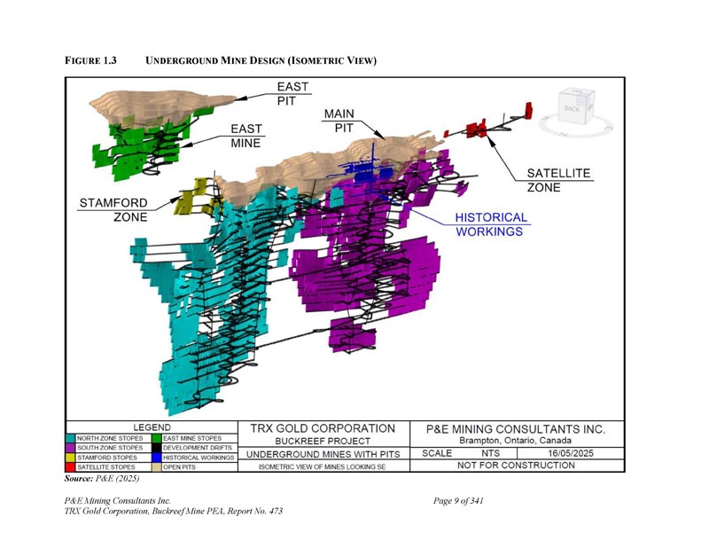 F IGURE 1.3 U NDERGROUND M INE D ESIGN(I SOMETRIC V IEW)资料来源:P & E(2025)P & E Mining Consultants Inc. TRX Gold Corporation,Buckreef Mine PEA,报告第473号,共341页第9页