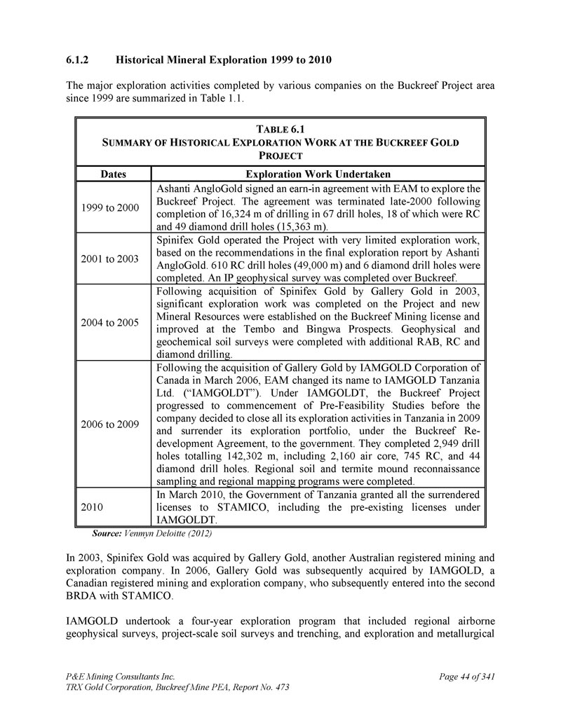 P & E Mining Consultants Inc. TRX Gold Corporation,Buckreef Mine PEA,第473号报告,3416.1.2历史矿产勘探1999-2010年各公司自1999年以来在Buckreef项目区完成的主要勘探活动汇总于表1.1。B UCKREEF G OLD P ROJECT勘探工作的TABLE 6.1 S概要进行日期Ashanti AngloGold与EAM签署了一项收益协议,以勘探Buckreef项目。该协议于2000年晚些时候终止,此前在67个钻孔中完成了16,324米的钻探,其中18个为RC钻孔,49个金刚石钻孔(15,363米)。根据Ashanti AngloGold最终勘探报告中的建议,1999年至2000年Spinifex Gold以非常有限的勘探工作运营该项目。完成RC钻孔610个(4.9万m),金刚石钻孔6个。在Buckreef上空完成了IP地球物理调查。2001年至2003年,继Gallery Gold于2003年收购Spinifex Gold之后,该项目完成了重要的勘探工作,并在Buckreef采矿许可证上建立了新的矿产资源,并在Tembo和Bingwa远景进行了改进。通过额外的RAB、RC和金刚石钻探完成了地球物理和地球化学土壤调查。2004年至2005年,继2006年3月加拿大IAMGOLD公司收购Gallery Gold后,EAM更名为IAMGOLD Tanzania Ltd.(“IAMGOLDT”)。在IAMGOLDT下,Buckreef项目进展到开始预可行性研究,之后该公司决定在2009年结束其在坦桑尼亚的所有勘探活动,并根据Buckreef再开发协议将其勘探组合移交给政府。他们完成2,949个钻孔,共142,302m,其中2,160个空心,745个RC,44个金刚石钻孔。完成区域土壤和白蚁丘侦察采样和区域测绘方案。2006年至2009年2010年3月,坦桑尼亚政府将所有交出的许可证授予STAMICO,包括IAMGOLDT下的预先存在的许可证。2010资料来源:Venmyn Deloitte(2012)2003年,Spinifex Gold被另一家澳大利亚注册采矿和勘探公司Gallery Gold收购。2006年,Gallery Gold随后被加拿大注册采矿和勘探公司IAMGOLD收购,后者随后与STAMICO签订了第二个BRDA。IAMGOLD开展了一项为期四年的勘探计划,其中包括区域机载地球物理调查、项目规模的土壤调查和挖沟,以及勘探和冶金