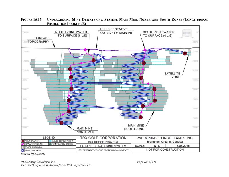 F IGURE 16.15 U NDERGROUND M INE D EWATERING S YSTEM,M AIN M INE N ORTH和S OUTH Z ONES(L ONGITUDINAL P ROJECTION L OOKING E)资料来源:P & E(2025)P & E Mining Consultants Inc. TRX Gold Corporation,Buckreef Mine PEA,第473号报告,共341页227