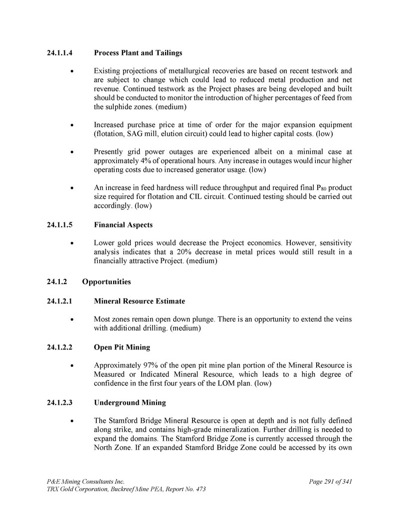 P & E Mining Consultants Inc. TRX Gold Corporation,Buckreef Mine PEA,第473号报告,34124.1. 1.4加工厂和尾矿现有的冶金回收率预测基于最近的测试工作,可能会发生变化,这可能导致金属产量和净收入减少。随着项目阶段的开发和建设,应继续进行测试工作,以监测从硫化物区引入更高百分比的饲料。(中)主要扩产设备(浮选、SAG磨机、洗脱回路)订单时采购价格上涨可能导致更高的资金成本。(低)目前电网停电,尽管是在最低限度的情况下,大约在4%的运营小时数。由于发电机使用量增加,停电的任何增加都会产生更高的运营成本。(低)进料硬度的增加会降低通量,并降低浮选和CIL电路所需的最终P80产品尺寸。应相应开展持续检测。(低)24.1. 1.5财务方面金价走低将降低项目经济性。然而,敏感性分析表明,金属价格下跌20%仍将导致一个具有财务吸引力的项目。(中)24.1.2机会24.1. 2.1矿产资源估算多数带保持开放向下暴跌。有机会通过额外钻探来延长矿脉。(中)24.1. 2.2露天矿开采矿产资源中露天矿计划部分约97%为实测或指示矿产资源,导致对LOM计划前四年的信心较高。(低)24.1. 2.3地下开采Stamford Bridge矿产资源深度开放,沿走向未完全界定,含有高品位矿化。需要进一步钻探以扩大领域。斯坦福桥区目前通过北区进入。如果扩大的斯坦福桥区可以由自己进入