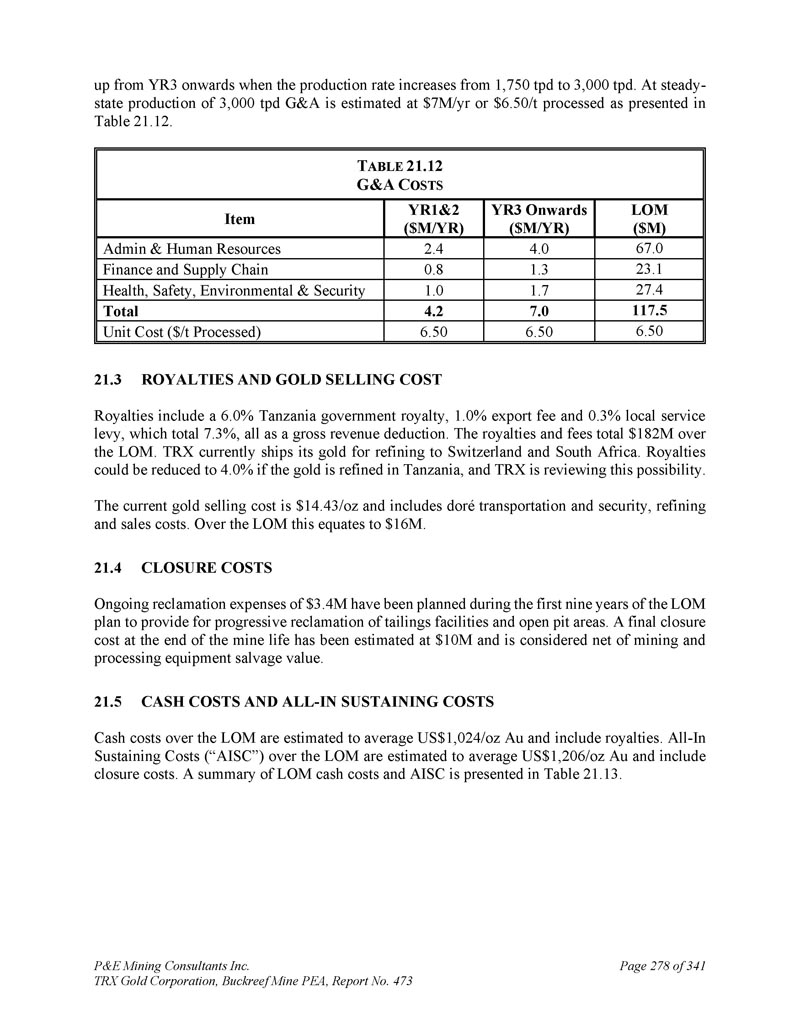 P & E Mining Consultants Inc. TRX Gold Corporation,Buckreef Mine PEA,Report No. 473 Page 278 of 341 from YR 3 up when production rate increases from 1,750 tpd to 3,000 tpd。在稳态生产3000吨/年时,G & A估计为700万美元/年或6美元。50/t加工如表21所示。12 .T ABLE 21.12 G & A C OSTS LOM($ M)YR3起($ M/YR)YR1 & 2($ M/YR)项目67.04.0 2.4行政和人力资源23.1 1.3 0.8财务和供应链27.4 1.7 1.0健康、安全、环境和安保117.57.04.2总计6.506.506.50单位成本($/t处理)3。版税和黄金销售成本版税包括6。0%坦桑尼亚政府版税,1。0%出口费和0。3%地方服务税,共7。3%,全部作为毛收入扣除。版税和费用总计1.82亿美元超过LOM。TRX目前将其用于提炼的黄金运往瑞士和南非。特许权使用费可减至4。0%,如果黄金在坦桑尼亚精炼,TRX正在审查这种可能性。目前黄金卖出成本为14美元。43/oz并包括dor é运输和安全、精炼和销售成本。超过LOM,这相当于1600万美元。4。关闭成本持续的复垦费用为3美元。在LOM计划的前九年中,已经规划了4m,以提供尾矿设施和露天区的逐步复垦。矿山寿命结束时的最终关闭成本估计为1000万美元,被认为是采矿和加工设备残值的净额。5.现金成本和全部维持成本现金成本超过LOM估计平均为1,024美元/盎司金,包括特许权使用费。LOM的All-In持续成本(“AISC”)估计平均为1,206美元/盎司金,其中包括关闭成本。LOM现金成本和AISC汇总见表21。13 .