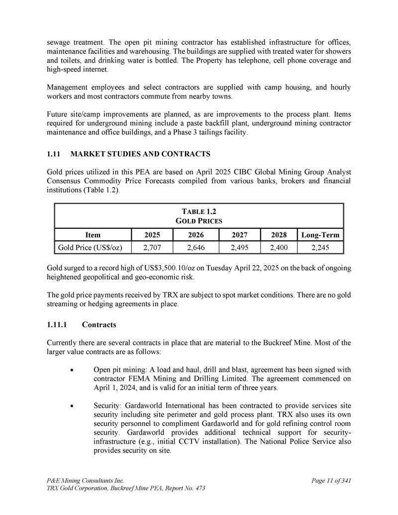 P & E Mining Consultants Inc. TRX Gold Corporation,Buckreef Mine PEA,Report No.473 Page 11 of 341污水处理。露天采矿承包商建立了办公室、维修设施和仓储的基础设施。这些建筑供应经过处理的淋浴和厕所用水,饮用水是瓶装的。物业有电话、手机覆盖、高速互联网。向管理员工和选定的承包商提供营地住房,小时工和大多数承包商从附近的城镇通勤。计划对未来的场地/营地进行改进,对工艺工厂的改进也是如此。地下采矿所需项目包括浆料回填厂、地下采矿承包商维修和办公楼,以及3期尾矿设施。1.11市场研究和合同本PEA中使用的黄金价格基于2025年4月CIBC全球矿业集团分析师共识商品价格预测,这些预测由多家银行、经纪商和金融机构汇编而成(表1。2 ) .T ABLE 1.2 G OLD P RIES Long-Term 2028202720262025 Item 2,2452,4002,4952,6462,707 Gold Price(US $/oz)2025年4月22日(星期二),在地缘政治和地缘经济风险持续加剧的背景下,黄金飙升至3,500.10美元/oz的历史新高。TRX收到的黄金价格付款视现货市场情况而定。没有到位的黄金流动或对冲协议。1.合同目前有几份合同对Buckreef矿具有重要意义。大部分较大价值的合同如下:露天采矿:一次装载和运输,钻探和爆破,已与承包商FEMA Mining and Drilling Limited签署协议。该协议于2024年4月1日开始生效,初始有效期为三年。安保:GardaWorld International已签约提供包括场地周界和黄金工艺厂房在内的服务场地安保。TRX也使用了自己的安全人员来称赞GardaWorld,并为黄金精炼控制室的安全。GardaWorld为安全提供额外的技术支持-基础设施(例如。,初始CCTV安装)。国家警察局也在现场提供安保。