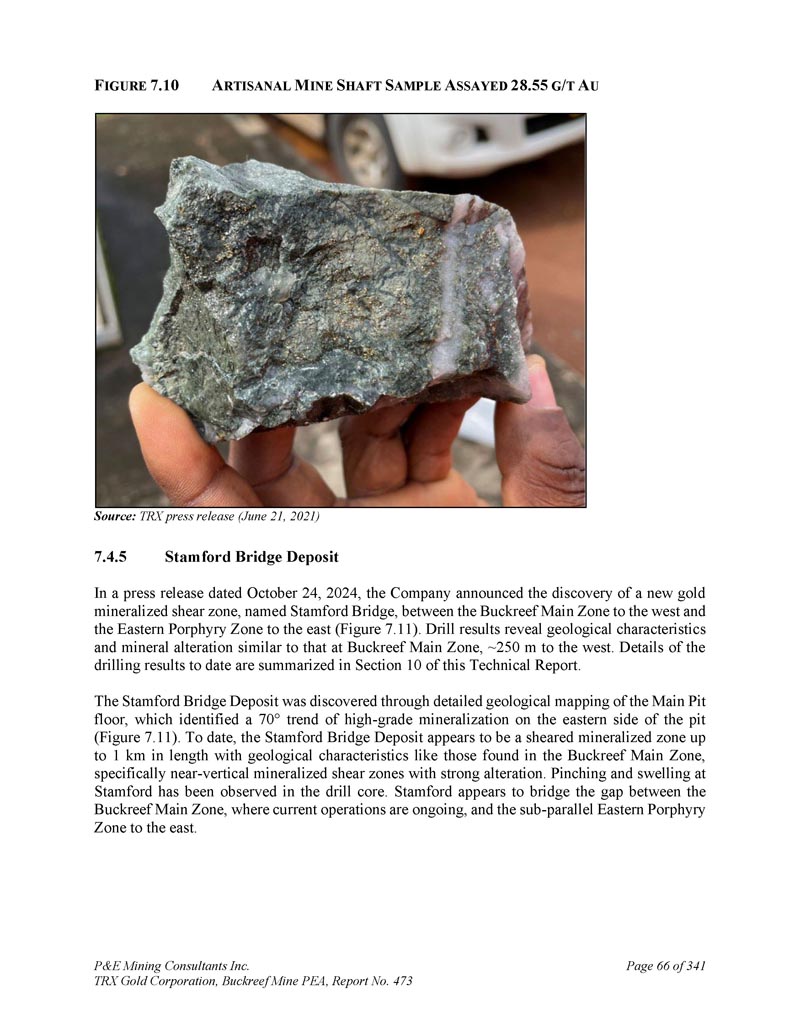 F IGURE 7.10 A RTISANAL M INE S HAFT S AMPLE A SSAYED 28.55 g/T A U来源:TRX新闻稿(2021年6月21日)7.4.5 Stamford Bridge矿床在日期为2024年10月24日的新闻稿中,公司宣布在西边的Buckreef主带和东边的东部斑岩带之间发现了一个新的金矿化剪切带,名为Stamford Bridge(图7。11 ) .钻探结果揭示了与Buckreef主带相似的地质特征和矿物蚀变,向西~250m。本技术报告第10节概述了迄今为止的钻探结果的详细情况。Stamford Bridge矿床是通过对主坑底板进行详细地质填图发现的,确定了坑东侧高品位矿化的70 ↓趋势(图7。11 ) .迄今为止,斯坦福桥矿床似乎是一个长达1公里的剪切矿化带,其地质特征与在Buckreef主带中发现的地质特征相似,特别是具有强烈蚀变的近-垂直矿化剪切带。在钻芯中观察到了斯坦福德的挤压和膨胀。斯坦福德似乎弥合了目前正在进行作业的Buckreef主区与东部亚平行的东部斑岩区之间的差距。P & E Mining Consultants Inc. TRX Gold Corporation,Buckreef Mine PEA,报告第473页,共341页