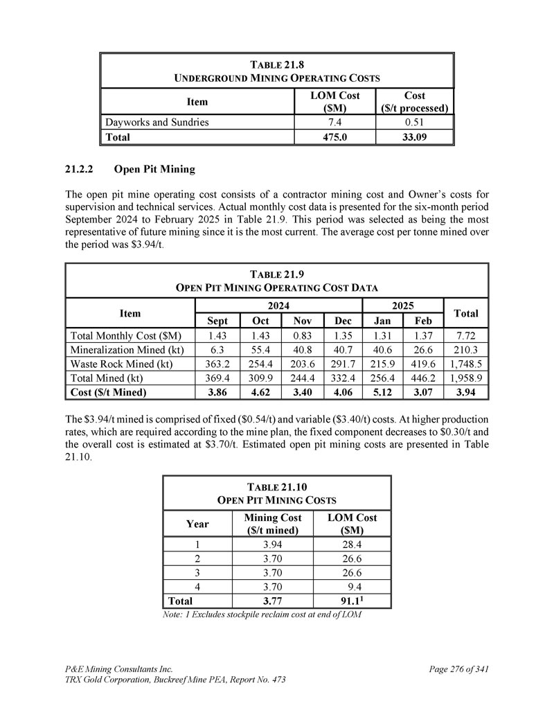 P & E Mining Consultants Inc. TRX Gold Corporation,Buckreef Mine PEA,Report No. 473 Page 276 of 341 T ABLE 21.8 U NDERGROUND M INING O PERATING C OSTS Cost($/t processed)LOM Cost($ M)Item 0.5 17.4 Dayworks and sundries 33.09 475.0 total 21.2.2露天采矿露天矿运营成本包括承包商采矿成本和业主的监督和技术服务成本。表21列出了2024年9月至2025年2月这六个月期间的每月实际费用数据。9 .这一时期被选为未来矿业最具代表性的时期,因为它是最新的。在此期间,每吨开采的平均成本为3美元。94/t。T ABLE 21.9 O PEN P IT M INing O PERATING C OST D ATA总计20252024年项目2月1月12月11月10月9月7.72 1.37 1.31 1.35 0.83 1.43 1.43每月总成本(百万美元)210.3 26.64 0.64 0.74 0.85 5.46.3矿化开采(千吨)1,748.54 19.62 15.92 91.7203.62 54.4363.2废石开采(千吨)1,958.94 46.2256.433 2.42 44.4309.93 69.4总开采(千吨)3.94 3.07 5.12 4.06 3.40 4.62 3.86成本(美元/吨开采)3美元。94/t开采由固定(0美元。54/t)和可变(3美元。40/t)成本。在更高的生产率下,这是根据矿山计划要求的,固定部分减少到0美元。30/t,总成本估计为3美元。70/t。露天矿开采成本估算见表21。10 .T ABLE 21.10 O PEN P IT M INING C OSTS LOM成本($ M)采矿成本($/t开采)年份28.4 3.94 126.6 3.70 226.6 3.70 39.4 3.70 491.1 13.77总注:1不包括LOM结束时的库存回收成本