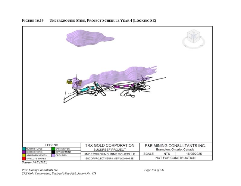 F IGURE 16.19 U NDERGROUIN M INE,P ROJECT S CHEDULE Y EAR 4(L OOKING SE)资料来源:P & E(2025)P & E Mining Consultants Inc. TRX Gold Corporation,Buckreef Mine PEA,报告第473页,共341页236