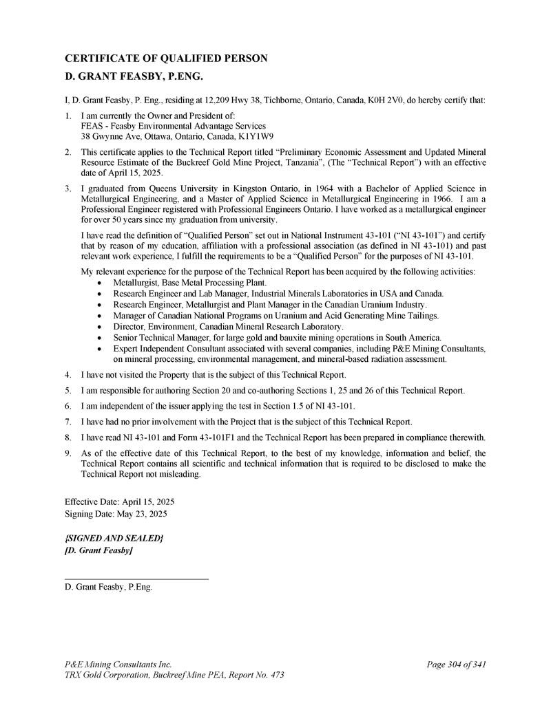 Qualified Person Certificate D. Grant FEASBY,P.NG。I,D. Grant Feasby,P. Eng.,residing at 12,209 HWY38,Tichborne,Ontario,Canada,K0H 2V0,兹证明:1。我目前是:FEAS-Feasby Environmental Advantage Services 38 Gwynne Ave,Ottawa,Ontario,Canada,K1Y1W9 2的所有者和总裁。本证书适用于题为“坦桑尼亚Buckreef金矿项目的初步经济评估和更新的矿产资源估算”的技术报告(“技术报告”),生效日期为2025年4月15日。3.我毕业于安大略省金斯敦的皇后大学,1964年获得冶金工程应用科学学士学位,1966年获得冶金工程应用科学硕士学位。我是在安大略省专业工程师协会注册的专业工程师。大学毕业后,我做了50多年的冶金工程师。本人已阅读National Instrument 43-101(“NI 43-101”)中对“合格人员”的定义,并证明由于本人的学历、与专业协会的隶属关系(如NI 43-101中的定义)和过去的相关工作经验,本人符合NI 43-101中的“合格人员”要求。我为技术报告目的的相关经验是通过以下活动获得的:冶金学家,贱金属加工厂。美国和加拿大工业Minerals实验室研究工程师和实验室经理。加拿大铀行业研究工程师、冶金学家和工厂经理。加拿大国家制铀和制酸矿山尾矿项目经理。加拿大矿物研究实验室环境主任。高级技术经理,负责南美大型黄金和铝土矿开采业务。与P & E Mining Consultants等多家公司有关联的专家独立顾问,涉及矿物加工、环境管理和基于矿物的辐射评估。4.我没有访问过本技术报告主题的物业。5.本人负责撰写本技术报告第20节及共同撰写第1、25、26节。6.我独立于应用NI 43-101第1.5节中的测试的发行人。7.我之前没有参与过本技术报告主题的项目。8.我已经阅读了NI 43-101和表格43-101F1,技术报告是按照这些标准编写的。9.截至本技术报告生效之日,据本人所知、所知及所信,技术报告载有为使技术报告不具误导性而须予披露的所有科技资料。生效日期:2025年4月15日签署日期:2025年5月23日{签署并盖章} [ D. Grant Feasby ] D. Grant Feasby,P.eng。P & E Mining Consultants Inc. TRX Gold Corporation,Buckreef Mine PEA,报告第473页,共341页第304页