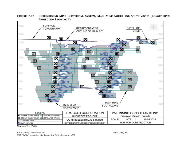 F IGURE 16.17 U NDERGROUND M INE E LECTRICAL S YSTEM,M AIN M INE N ORTH和S OUTH Z ONES(L ONGITUDINAL P ROJECTION L OOKING E)资料来源:P & E(2025)P & E Mining Consultants Inc. TRX Gold Corporation,Buckreef Mine PEA,第473号报告,共341页第230页