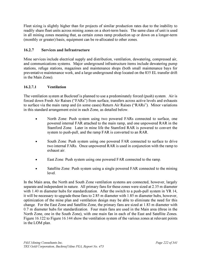 P & E Mining Consultants Inc. TRX Gold Corporation,Buckreef Mine PEA,Report No. 473 Page 222 of 341车队规模略高于类似生产率的项目,原因是无法在短期内随时跨矿区共享车队单元。所有矿区都使用同一级别的机组,这意味着,随着某些区域在更长期(每月或更长时间)的基础上提高或降低产量,设备可以重新分配给其他区域。7.服务和基础设施矿山服务包括电力供应和分配、通风、脱水、压缩空气和通信系统。地下主要基础设施项目包括脱水泵站、避难站、杂志和维修车间(既有预防性维修工作的小型维修舱,也有位于主区835 EL换乘漂移上的大型地下车间)。1.通风通风Buckreef的通风系统计划使用主要是强制(推动)系统。空气被迫从地面下降新鲜空气提升(“FARs”),通过主坡道和(在某些情况下)回程空气提升(“RARs”)跨越活动水平和排气到地面。每个区域都存在这种标准安排的微小差异,详情如下。北区:推动系统使用两个连接到地面的动力FAR,一个连接到主坡道的动力内部FAR,以及斯坦福特区的一个无动力RAR。在我生命的后期,斯坦福RAR将提供动力,将系统转换为推拉,坡道FAR将转换为RAR。南区:推动系统使用一个连接到地面的动力FAR驱动两个内部FAR。一旦无动力的RAR与坡道配合使用,以排出空气。东区:使用一个连接到坡道的动力FAR推动系统。卫星区:使用连接到采矿水平的单一供电FAR的推送系统。在Main地区,北区和南区通风系统是相连的,然而,基本上是分开的和独立的。这些区域的所有主风扇尺寸均为2。直径35米,带1。直径40米的集线器,用于标准化。YR14切换到推拉系统后,将需要将这些风扇升级到2。直径85米,带1。直径85米的集线器,然而,优化矿山规划和通风设计或许能够消除这种改变的必要性。对于东区和卫星区,初级风扇的尺寸为1。直径83米,0。7米直径的集线器,用于标准化。主区使用四台主风机(北区三台,南区一台),东区和卫星区各一台主风机。图16。122至图16。144展示LOM方案中相关点位各区域的通风系统。