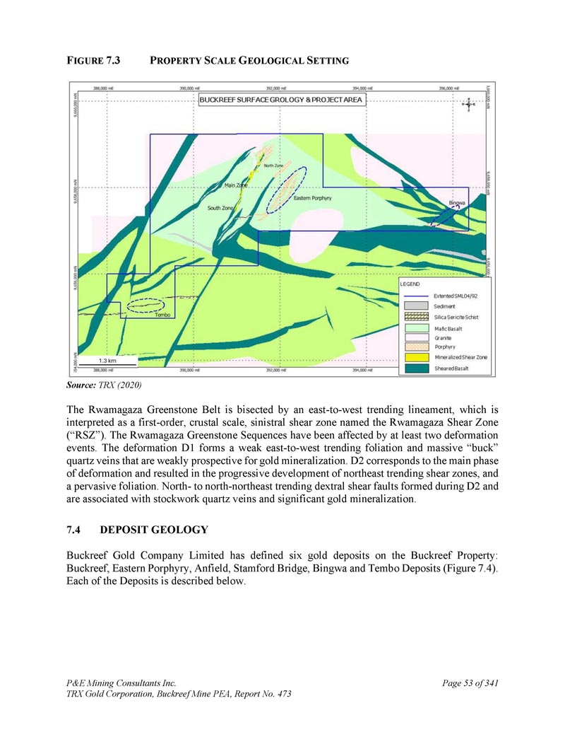 F IGURE 7.3 P ROPERTY S CALE G EOLOGICAL S ETTING资料来源:TRX(2020)Rwamagaza绿岩带被一条从东到西的趋势线一分为二,这被解释为一个一级、地壳尺度、左侧剪切带,名为Rwamagaza剪切带(“RSZ”)。Rwamagaza绿岩序列至少受到两次变形事件的影响。变形D1形成弱东向西向叶理和块状“块状”石英脉,金矿化前景较弱。D2对应变形的主要阶段并导致东北走向剪切带的逐渐发展,以及普遍的叶面。北向北-东北走向右旋剪切断层形成于D2期间,伴生有网状石英脉和显著的金矿化。7.4 Deposit GEOLOGY Buckreef Gold Company Limited在Buckreef矿区定义了六个金矿:Buckreef、Eastern Porphyry、Anfield、Stamford Bridge、Bingwa和Tembo矿床(图7。4 ) .每一项存款说明如下。P & E Mining Consultants Inc. TRX Gold Corporation,Buckreef Mine PEA,报告第473页,共341页
