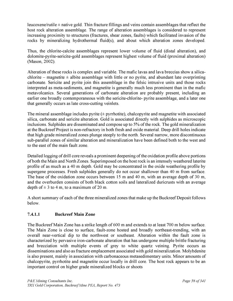 P & E Mining Consultants Inc. TRX Gold Corporation,Buckreef Mine PEA,Report No. 473 Page 58 of 341leucoxene/rutile“native gold。薄裂缝填充物和矿脉包含反映主岩蚀变组合的组合。蚀变组合的范围被认为代表着越来越接近结构(裂缝、剪切带、断层),这些结构通过使热液(s)矿化而促进了岩石的入侵,以及在哪些蚀变带周围发育。因此,绿泥石-方解石组合代表较低的流体体积(远端蚀变),白云石-黄铁矿-绢云母-金组合代表最高的流体体积(近端蚀变)(Mason,2002)。这些岩石的改变是复杂多变的。镁铁质熔岩和熔岩角砾岩显示出二氧化硅-绿泥石-磁铁矿“钠长石组合,几乎没有或没有黄铁矿,并有丰富的晚期叠印碳酸盐。绢云母和黄铁矿在长英质侵入单元和那些被解释为变质沉积物的岩石中加入了这种组合,磁铁矿通常比镁铁质变质火山岩中的突出程度要低得多。可能存在几代碳酸盐蚀变,包括一个较早的与绢云母-绿泥石-黄铁矿组合广泛同时代的蚀变,以及一个较晚的蚀变,通常发生为晚期交叉切割细脉。矿物组合包括黄铁矿(“磁黄铁矿”)、黄铜矿和磁铁矿,并伴有二氧化硅、碳酸盐和绢云母蚀变。金作为微观包裹体与硫化物直接伴生。硫化物被浸染,构成岩石的比例高达5%。Buckreef项目的金矿化在新鲜和氧化物材料中都是非耐火材料。钻孔较深,表明高品位矿化带向北陡然下沉。在主断裂带的西面和东面都界定了几个狭窄的、更不连续的类似蚀变和矿化的亚平行带。对钻芯的详细测井显示,主要和北部区域的部分区域上方的氧化剖面有一个突出的加深。叠加在主岩上的是深度高达4个0米的强烈风化红土剖面。金可能被表生过程集中在氧化物风化剖面中。新鲜的硫化物一般不会在距地表40米以下的地方出现。氧化带基部出现在15米至40米之间,平均深度为30米,覆盖层既有黑棉土,也有平均深度为“3至4米,最大20米的侧化硬壳。以下是构成Buckreef矿床的三个矿化带的简短摘要。7.4.1.1 Buckreef主带Buckreef主带走向长度为600米,延伸至地表以下至少700米。主带接近地表,断裂带为主,大致呈东北走向,整体近垂直向西北或东南倾斜。断裂带内的蚀变特征是普遍存在的碳酸铁蚀变,经历了多次脆性压裂和角砾化,有多次灰白石英脉化事件。黄铁矿以浸染的形式出现,也作为与金矿化相关的裂缝就位而出现。辉钼矿也存在,主要与碳质变沉积单元伴生。钻芯局部出现少量黄铜矿、磁黄铁矿和磁铁矿。主岩似乎是较高品位矿化块体或枝条的重要控制