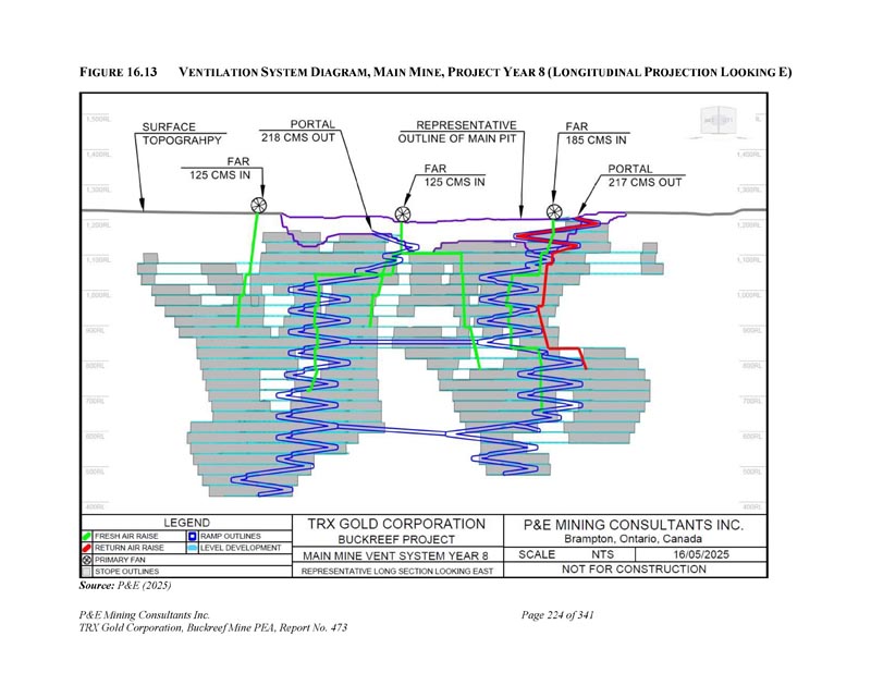 F IGURE 16.13 V ENTILATION S YSTEM D IAGRAM,M AIN M INE,P ROJECT Y EAR 8(L ONGITUDINAL P ROJECTION L OOKING E)资料来源:P & E(2025)P & E Mining Consultants Inc. TRX Gold Corporation,Buckreef Mine PEA,第473号报告,共341页第224页
